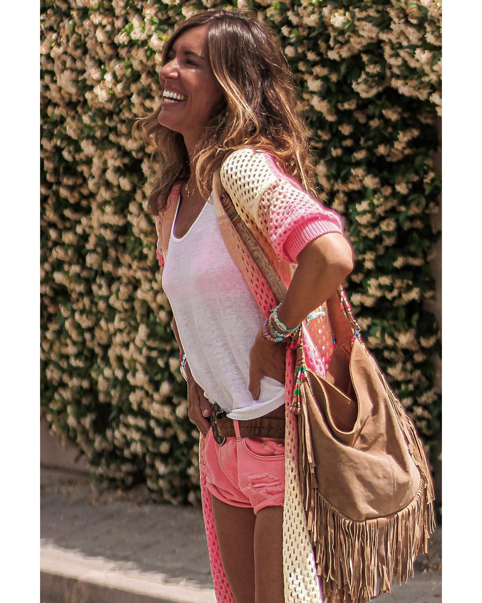 Azura Exchange Pink Ribbed Short Sleeve Ombre Eyelet Knitted Cardigan - S