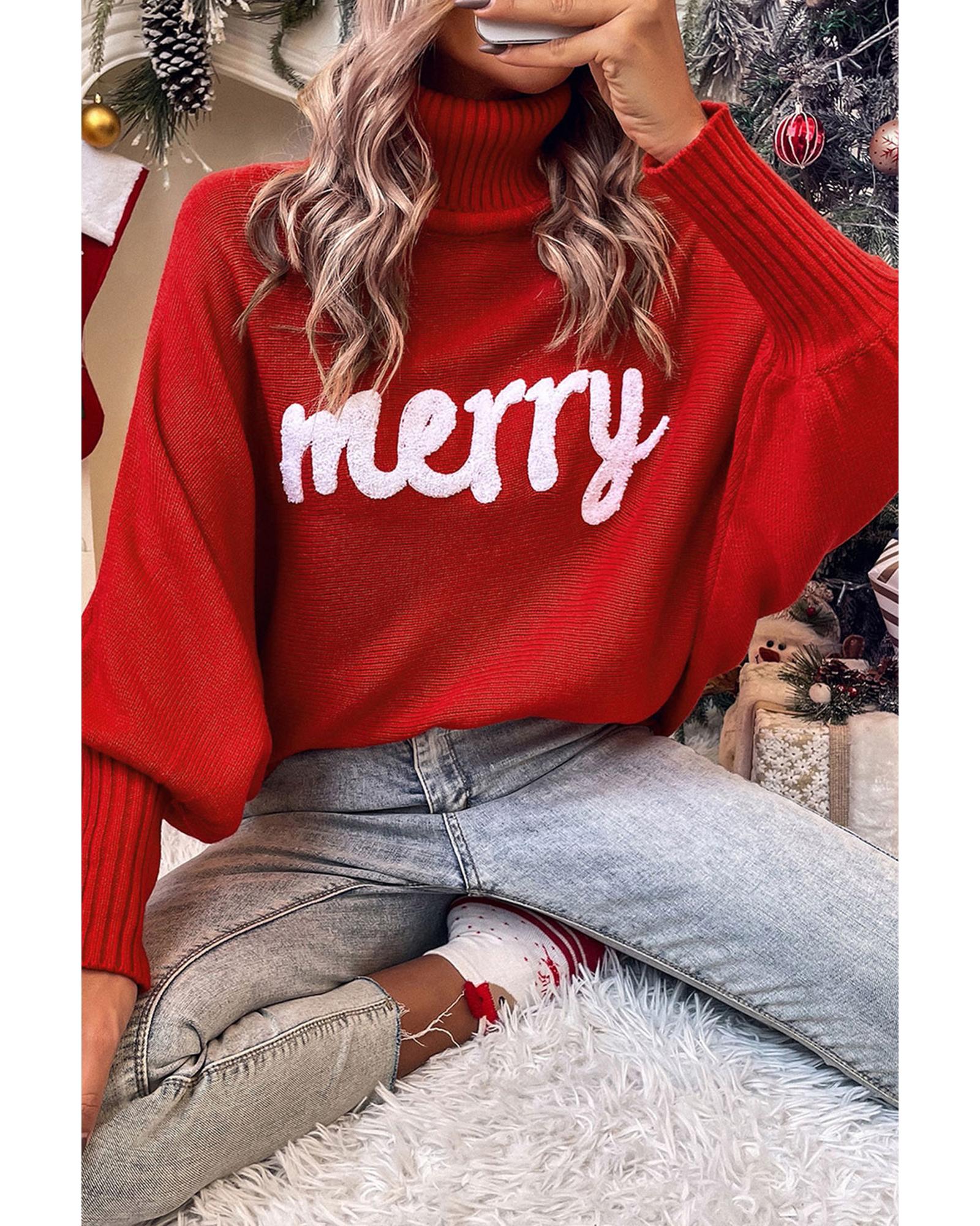 Azura Exchange Red Merry Letter Embroidered High Neck Sweater - S