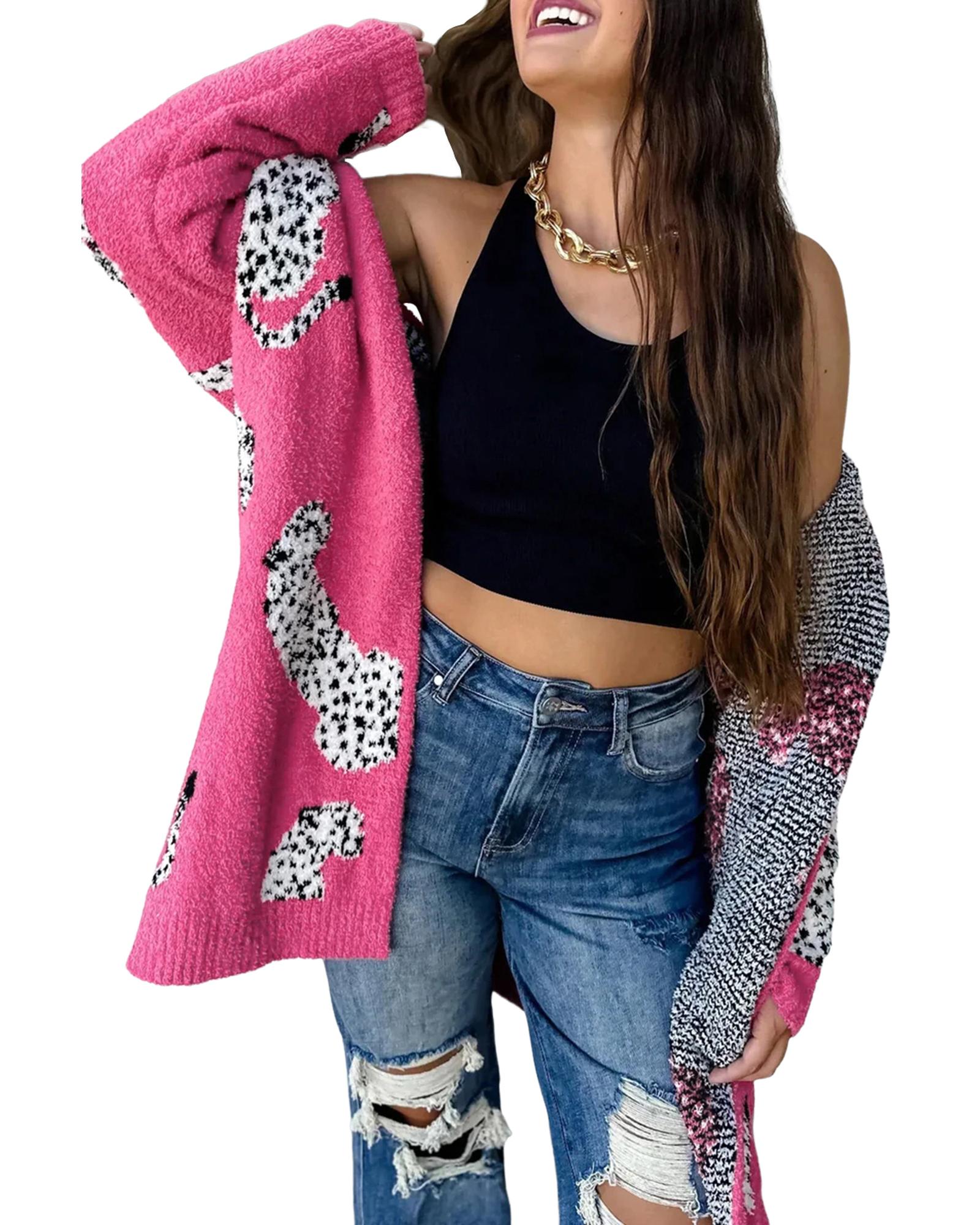 Azura Exchange Rose Red Cheetah Pattern Open Front Knitted Cardigan - M