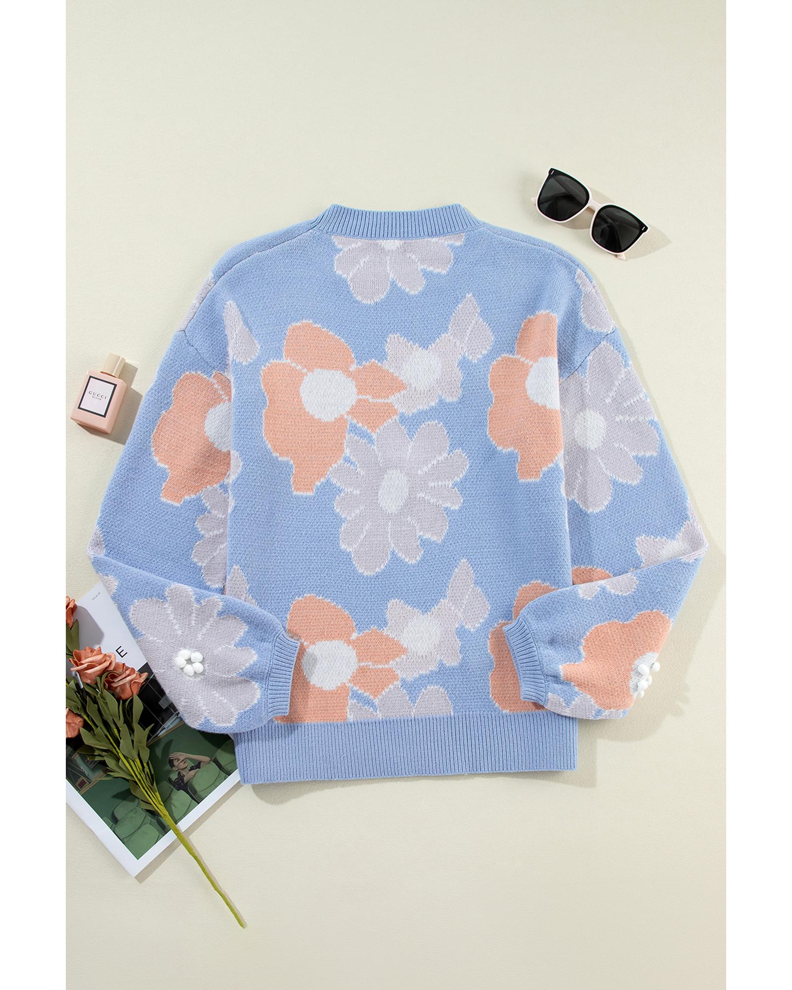 Beau Blue Floral O Neck Drop Shoulder Knitted Sweater - L
