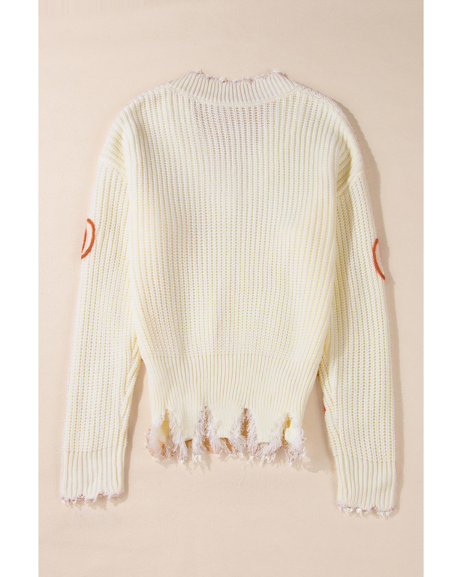 Beige Cable Knit Pumpkin Raw Hem V Neck Loose Sweater - M