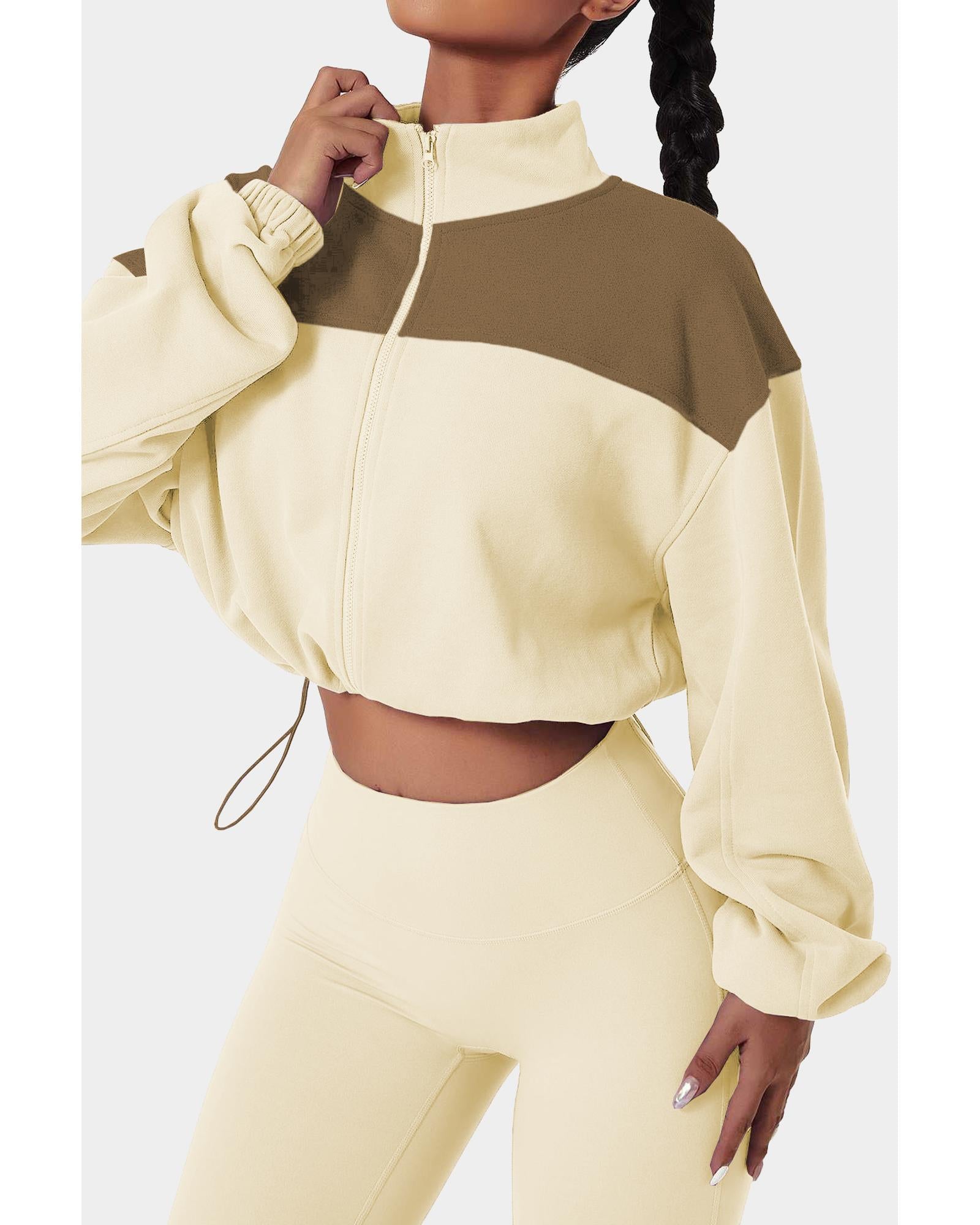 Beige Color Block Drawstring Cropped Athleisure Jacket - L