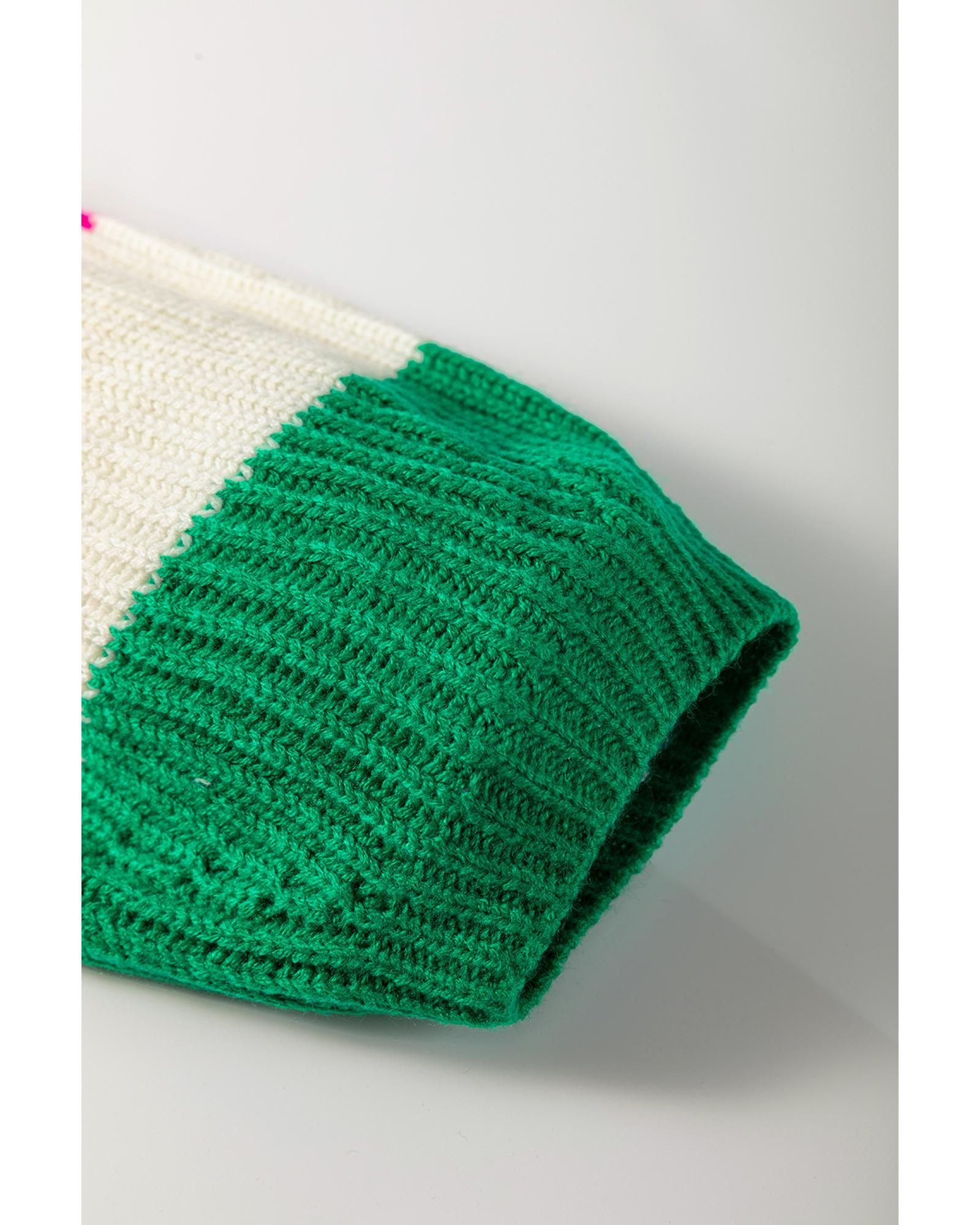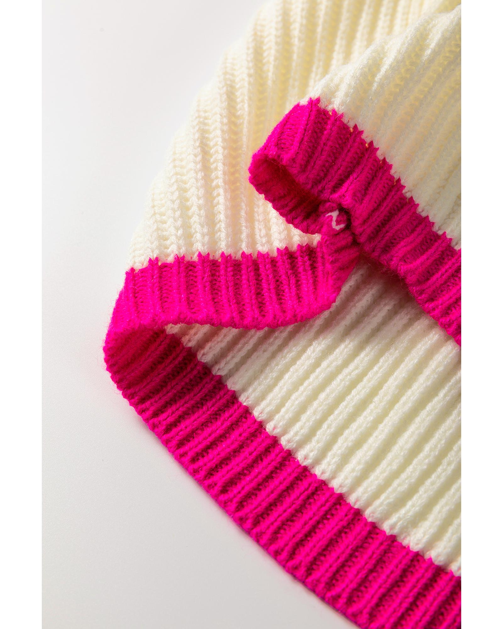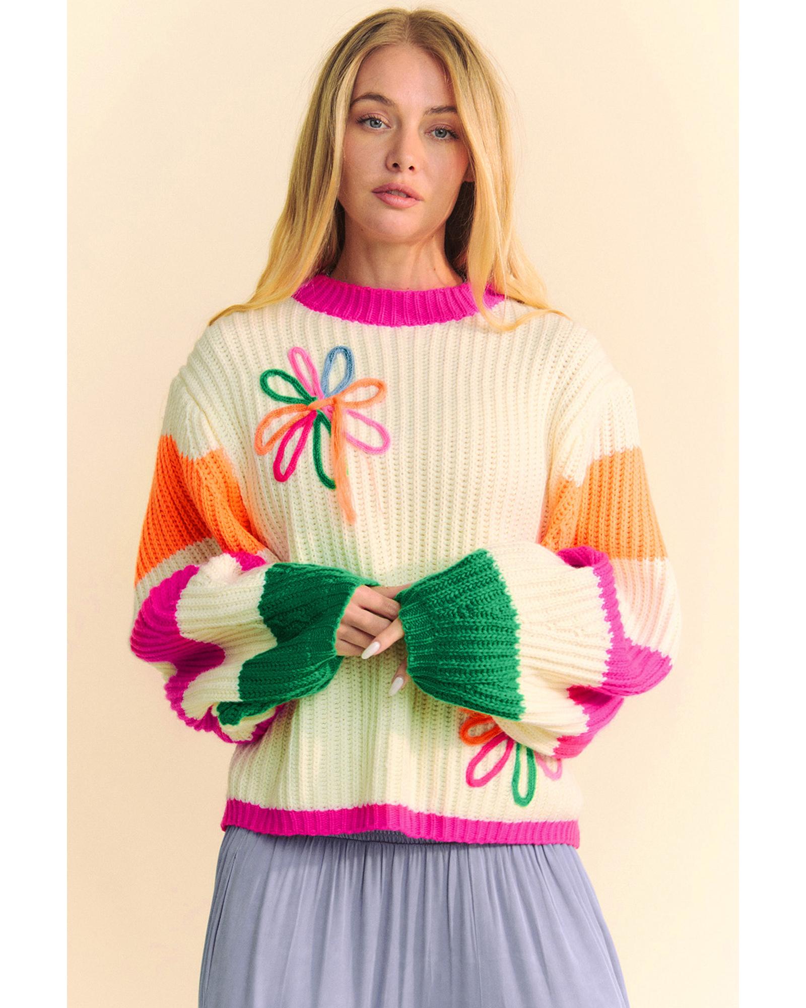 Beige Colorblock Flower Print Cable Knit Loose Sweater - XL