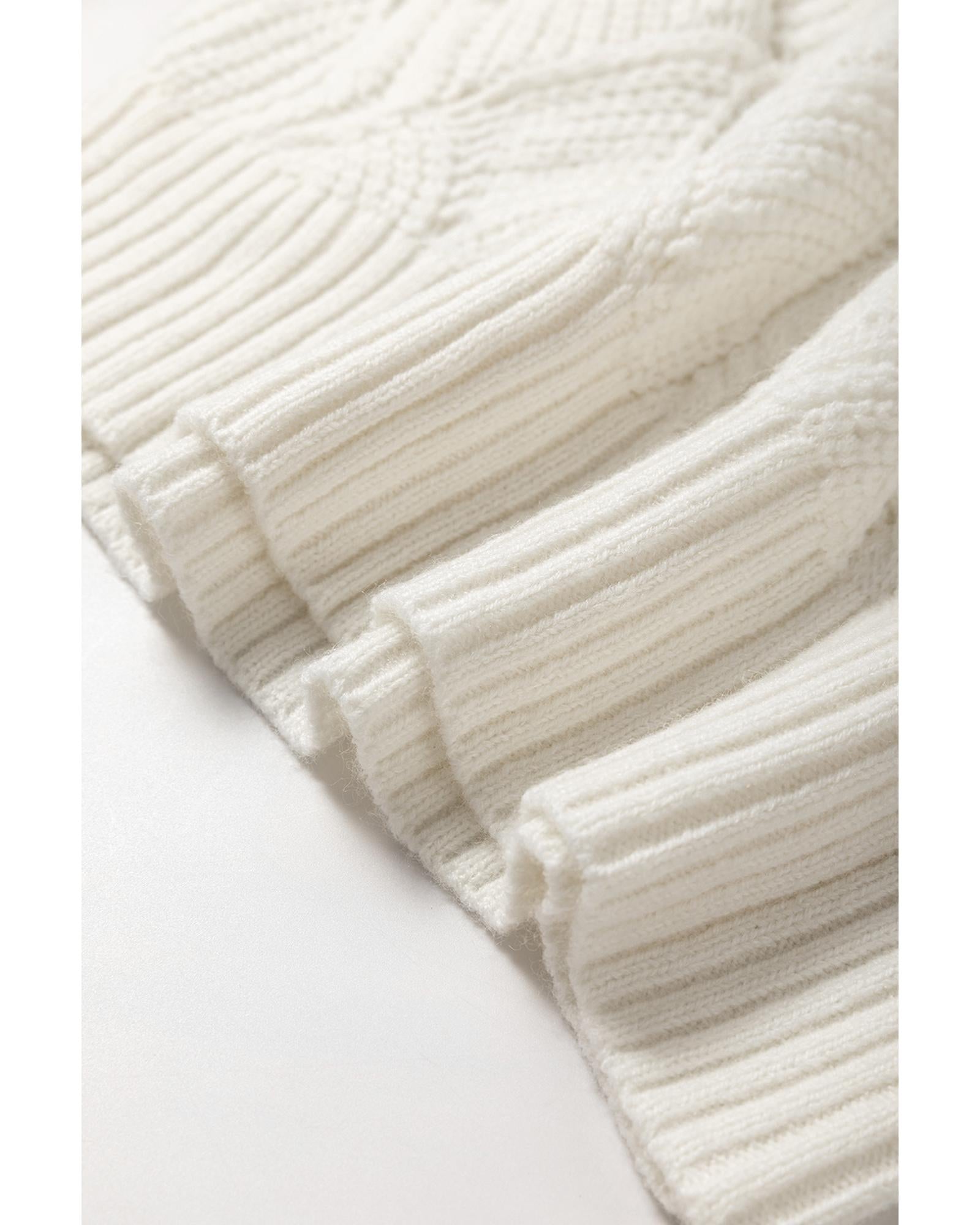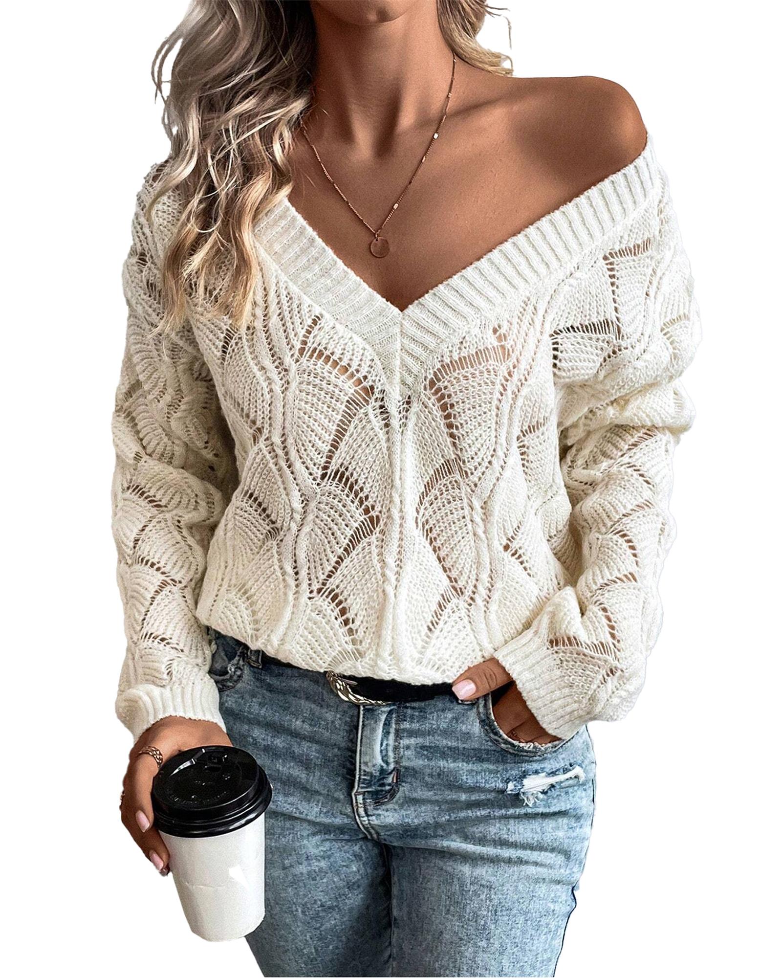 Beige Hollow Out Knit V Neck Drop Shoulder Sweater - L