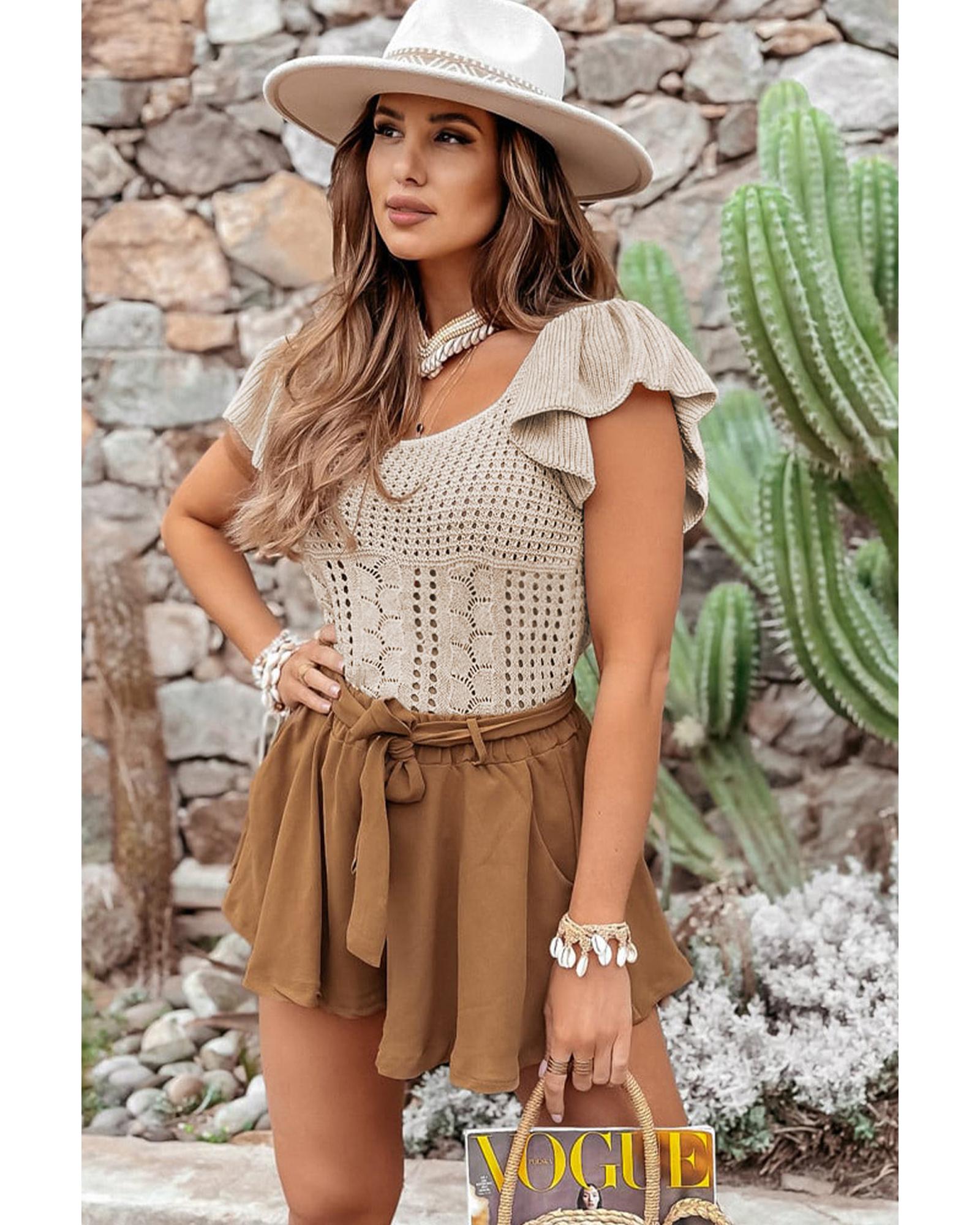 Beige Pointelle Knit Flutter Sleeve Sweater - XL
