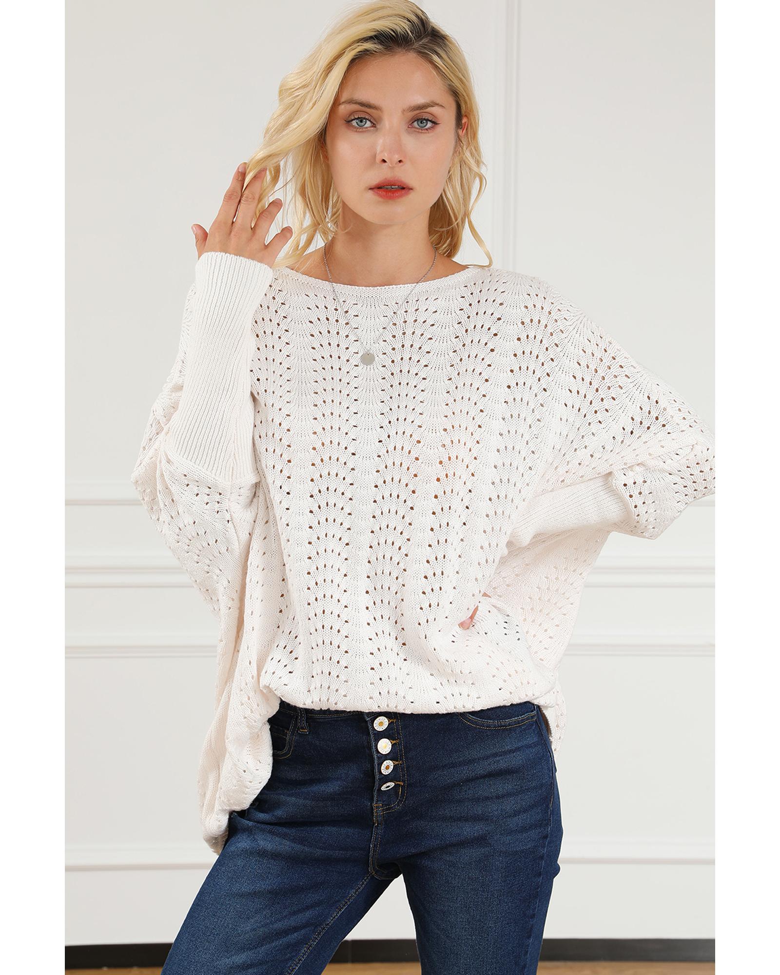 Beige Ribbed Hollow Knit Dolman Sleeve Sweater - S