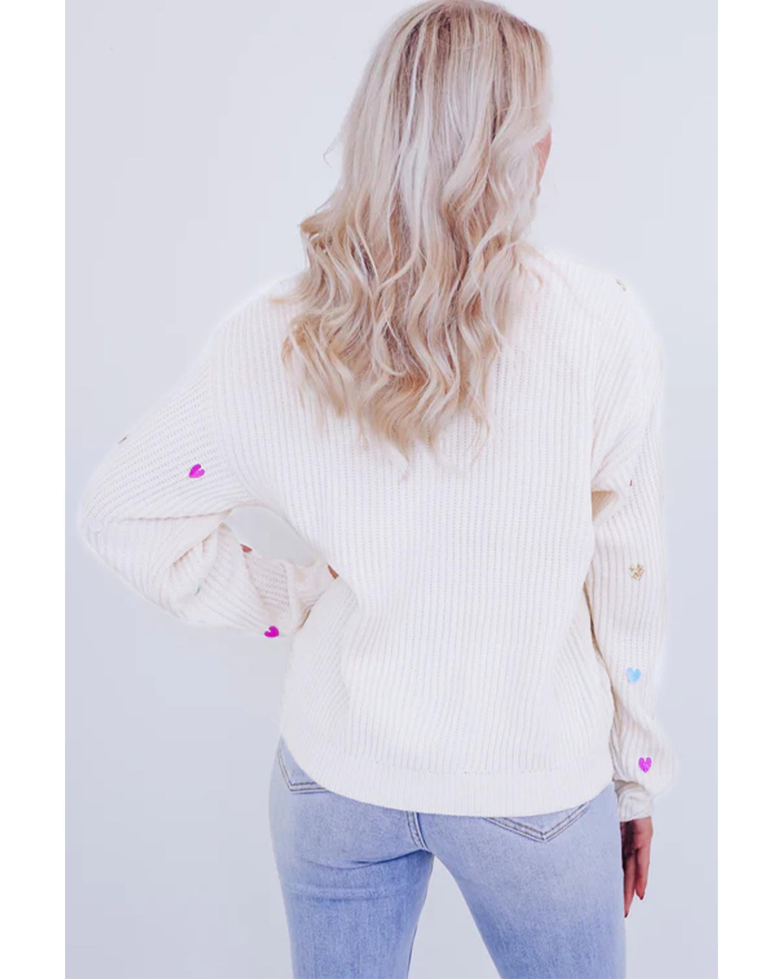 Beige Sequin Heart Shape Waffle Knit Round Neck Sweater - M