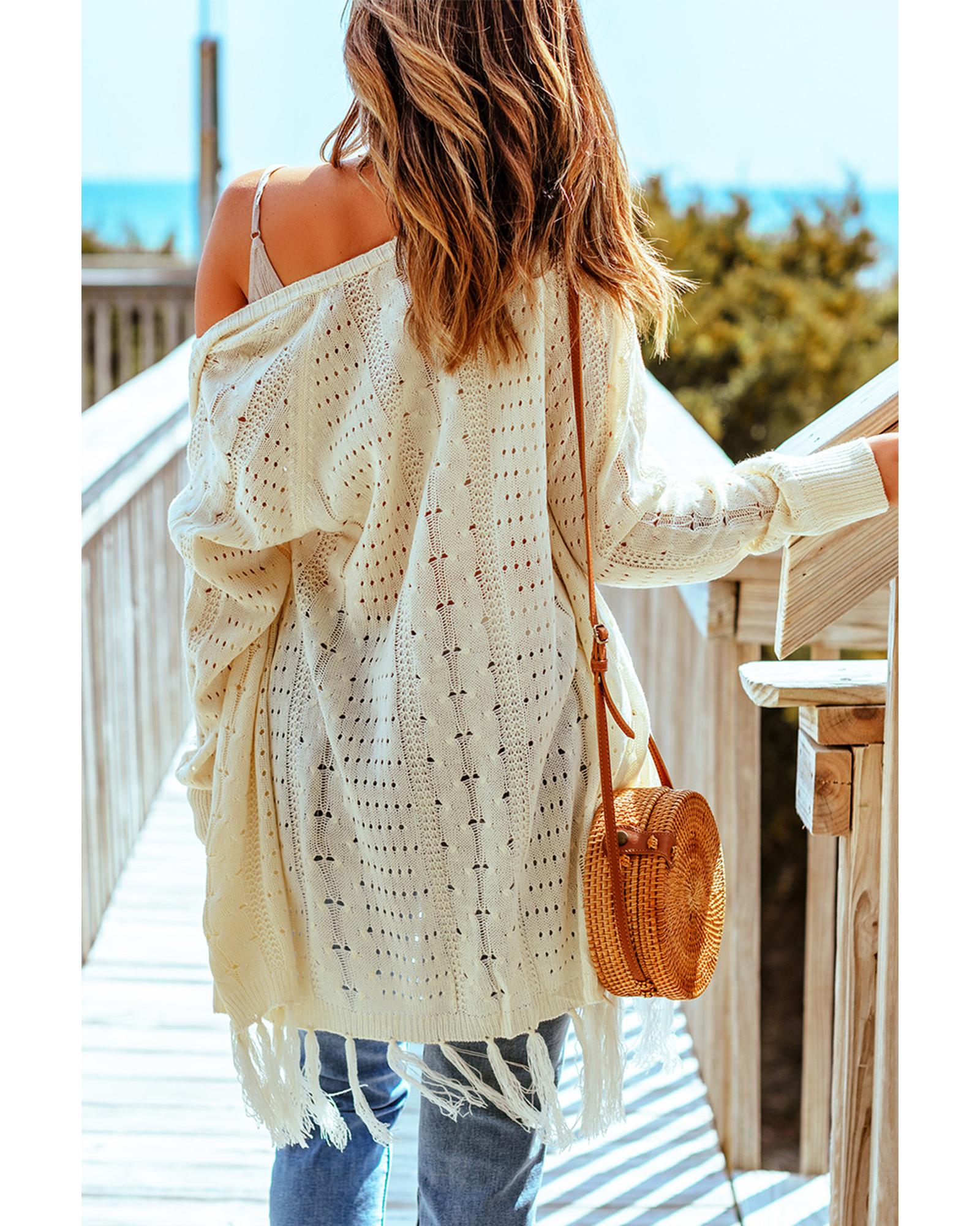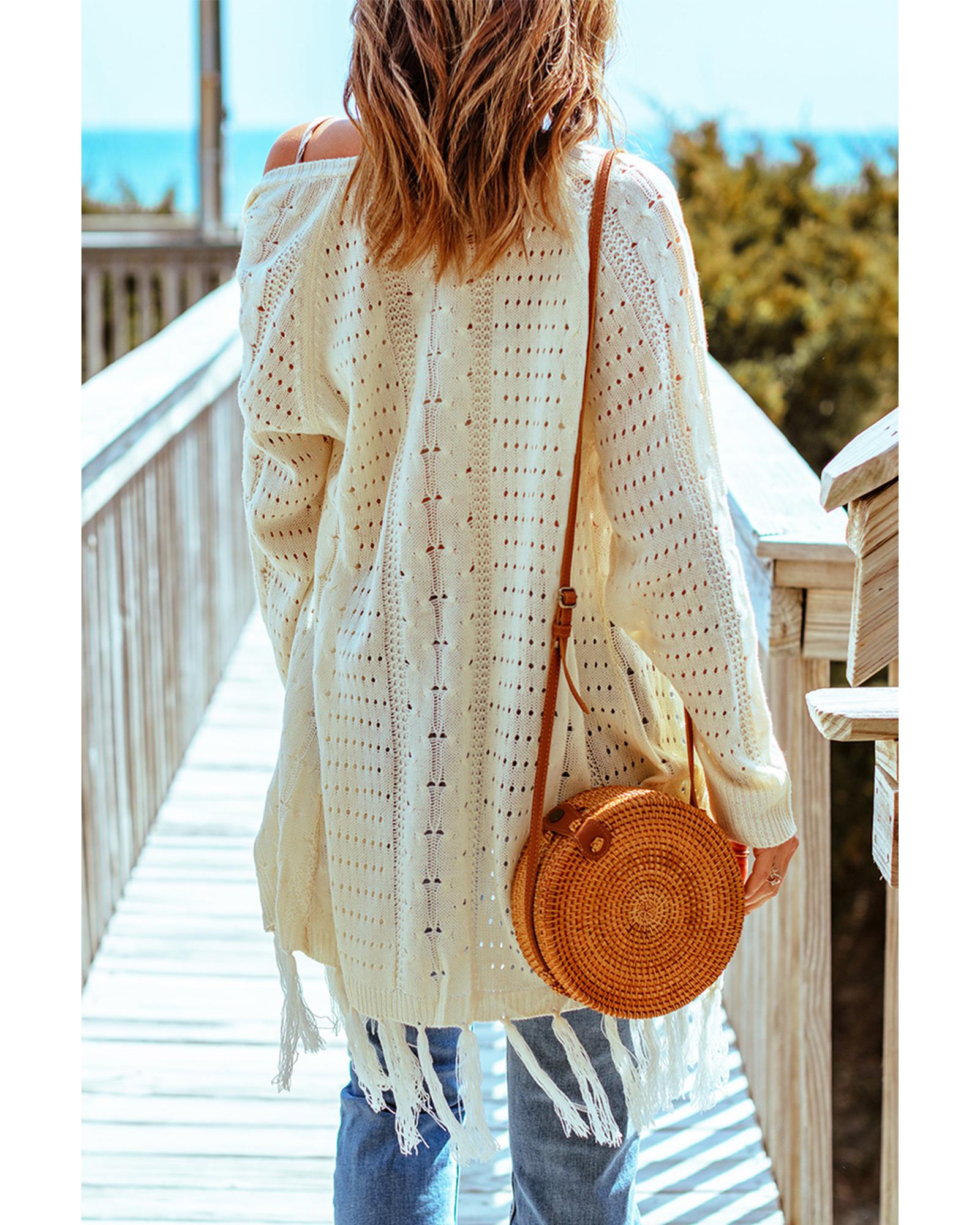 Beige Tasseled Hollow-out Cable Knit Cardigan - One Size