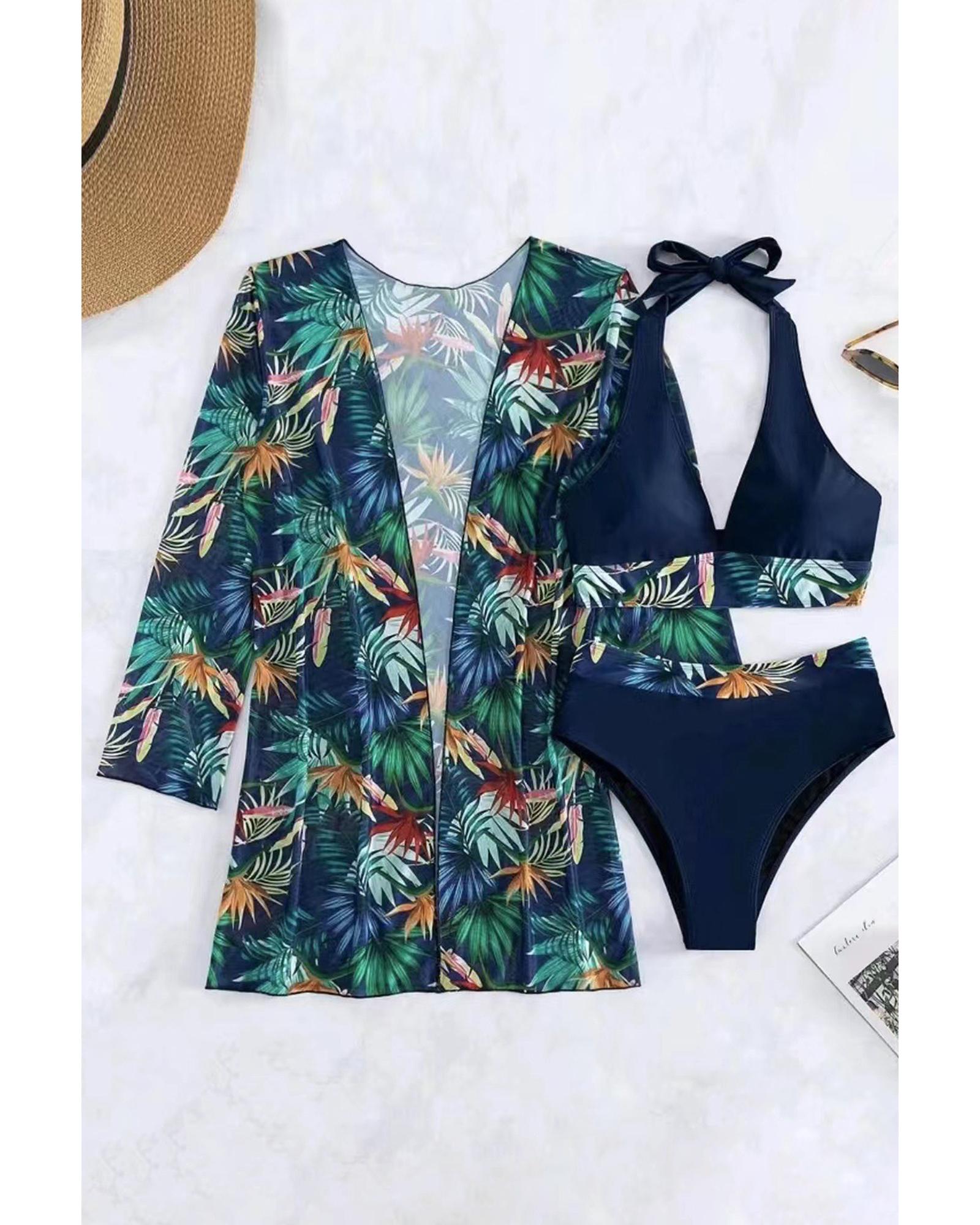 Black 3pcs Tropical Contrast Trim Halter Bikini Set with Cover up - S