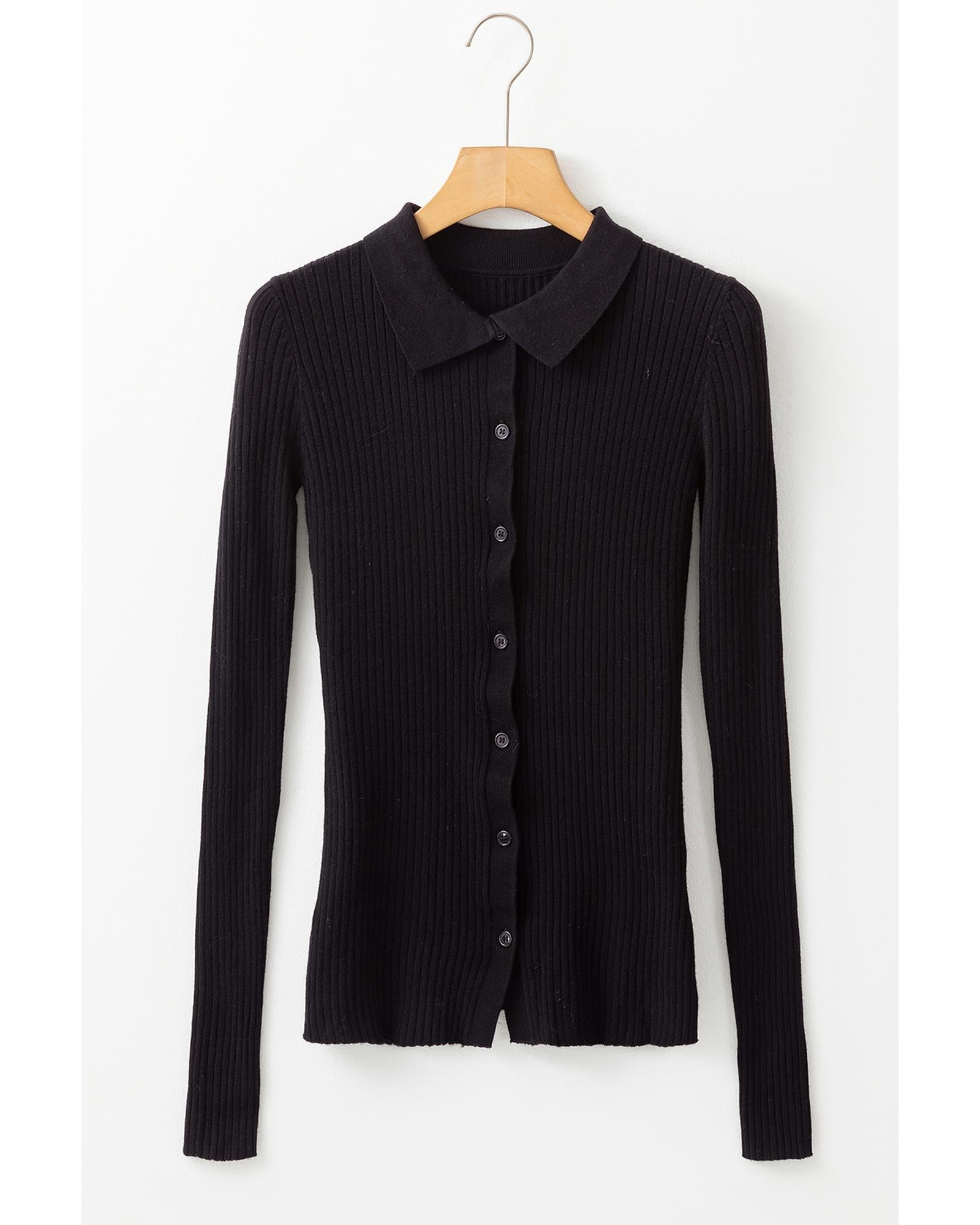 Black Ribbed Knit Collared Slim Fit Sweater Cardigan - L