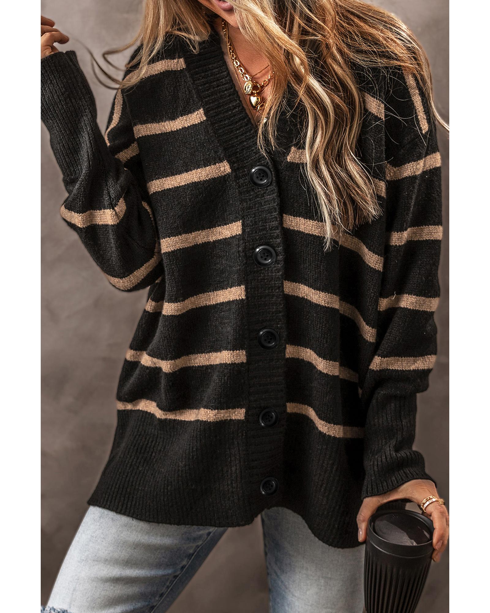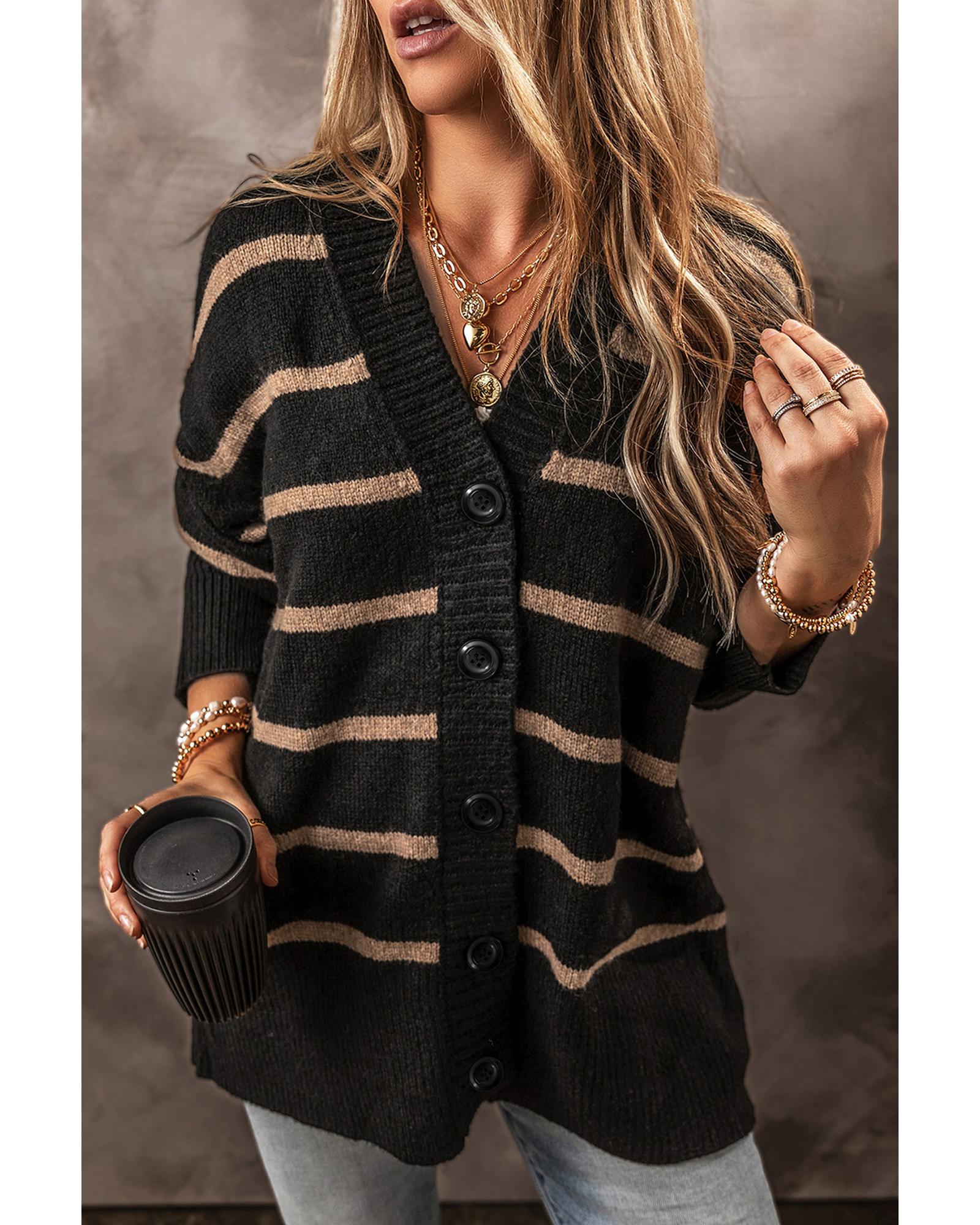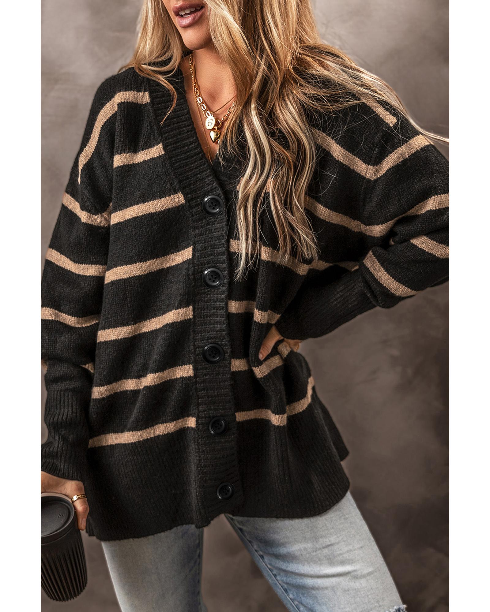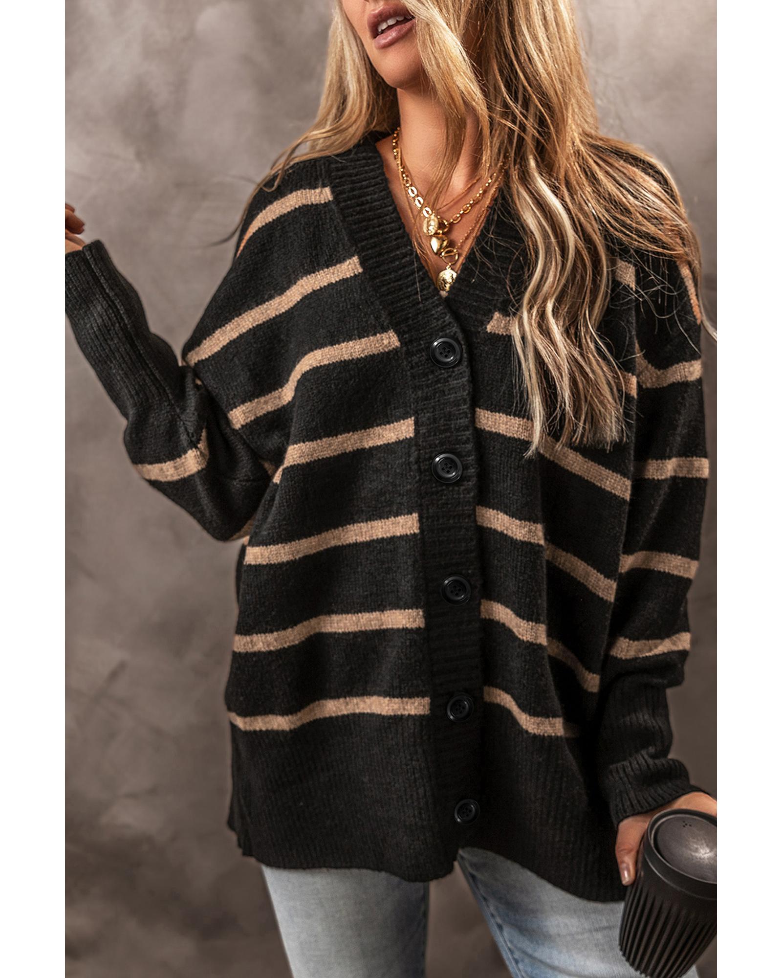 Black Stripe Buttoned V Neck Drop Shoulder Loose Cardigan - 2XL