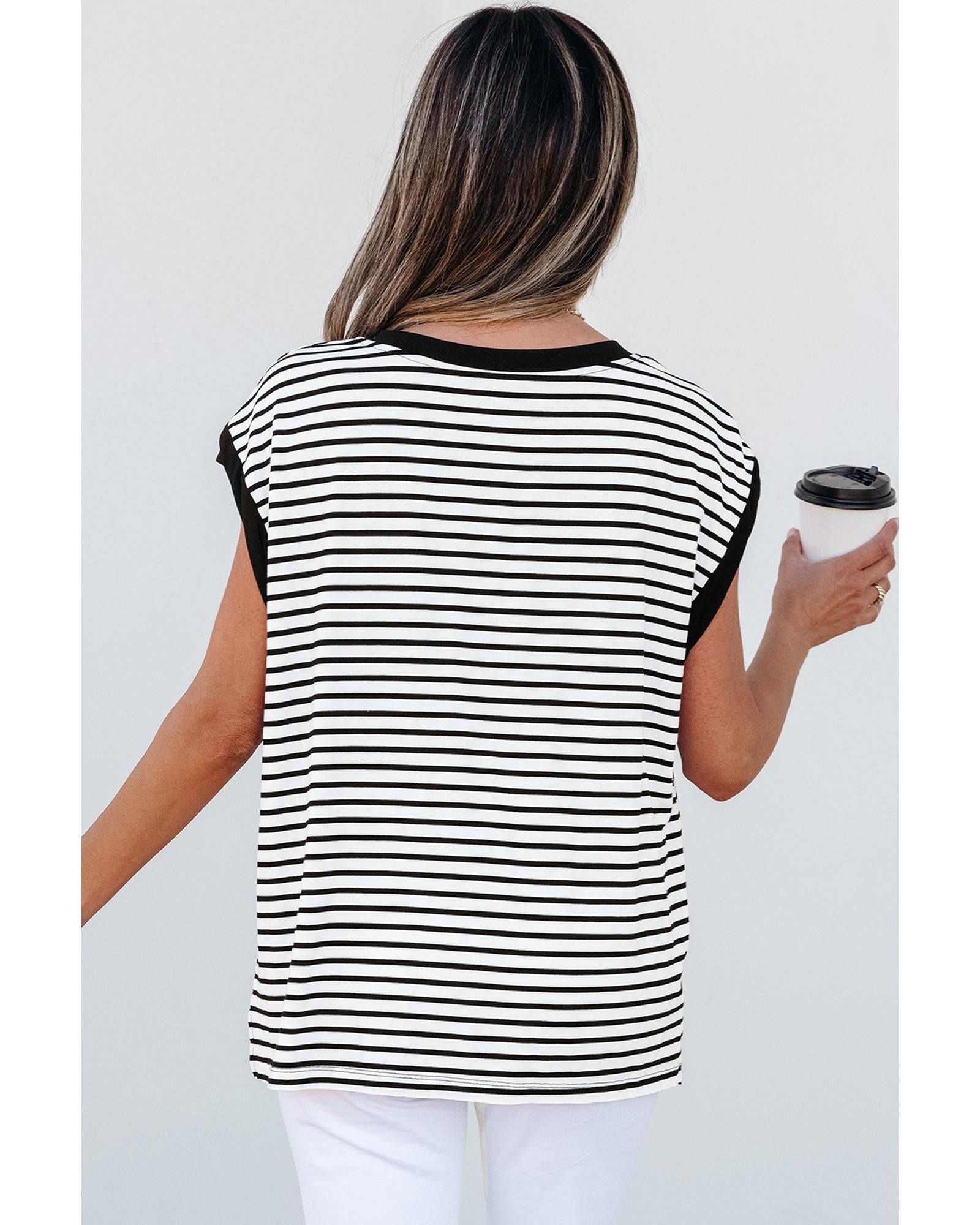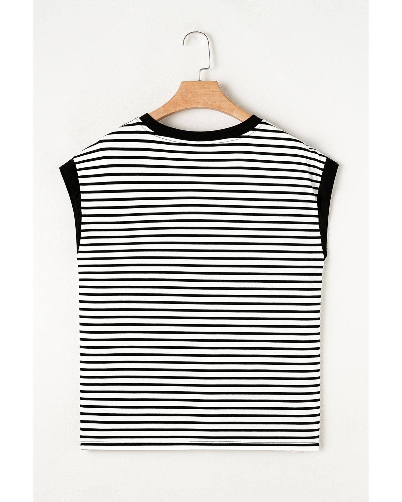 Black Stripe Sequined Lobster Patched Pocket Casual Tank Top - L