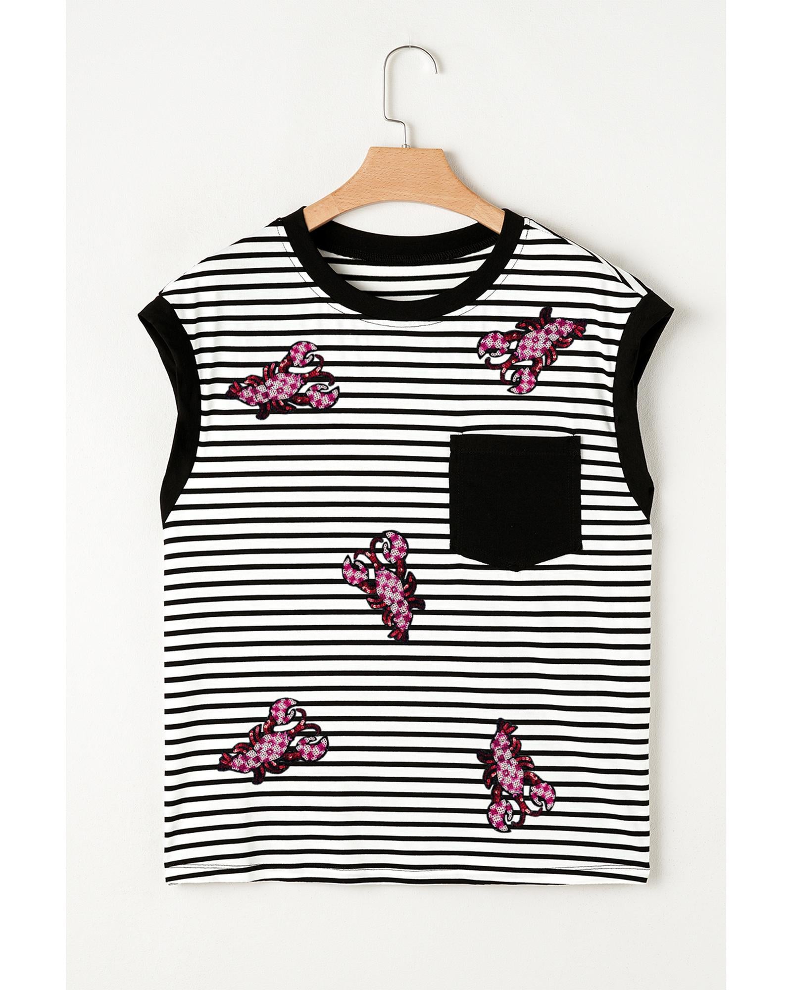 Black Stripe Sequined Lobster Patched Pocket Casual Tank Top - S