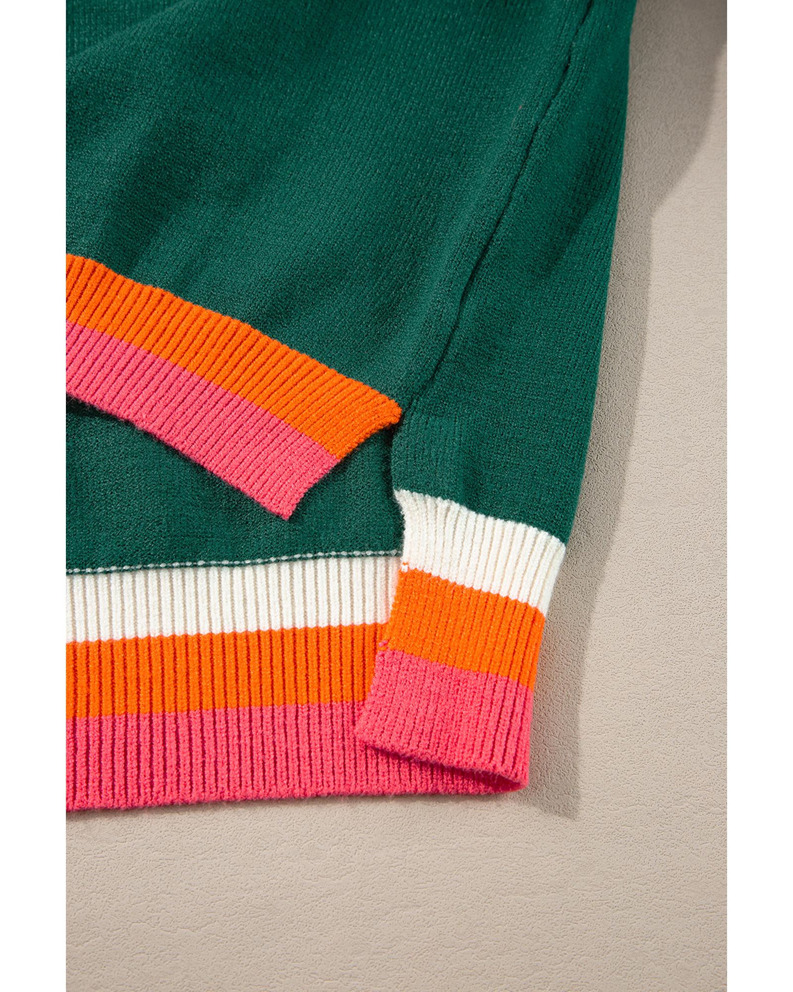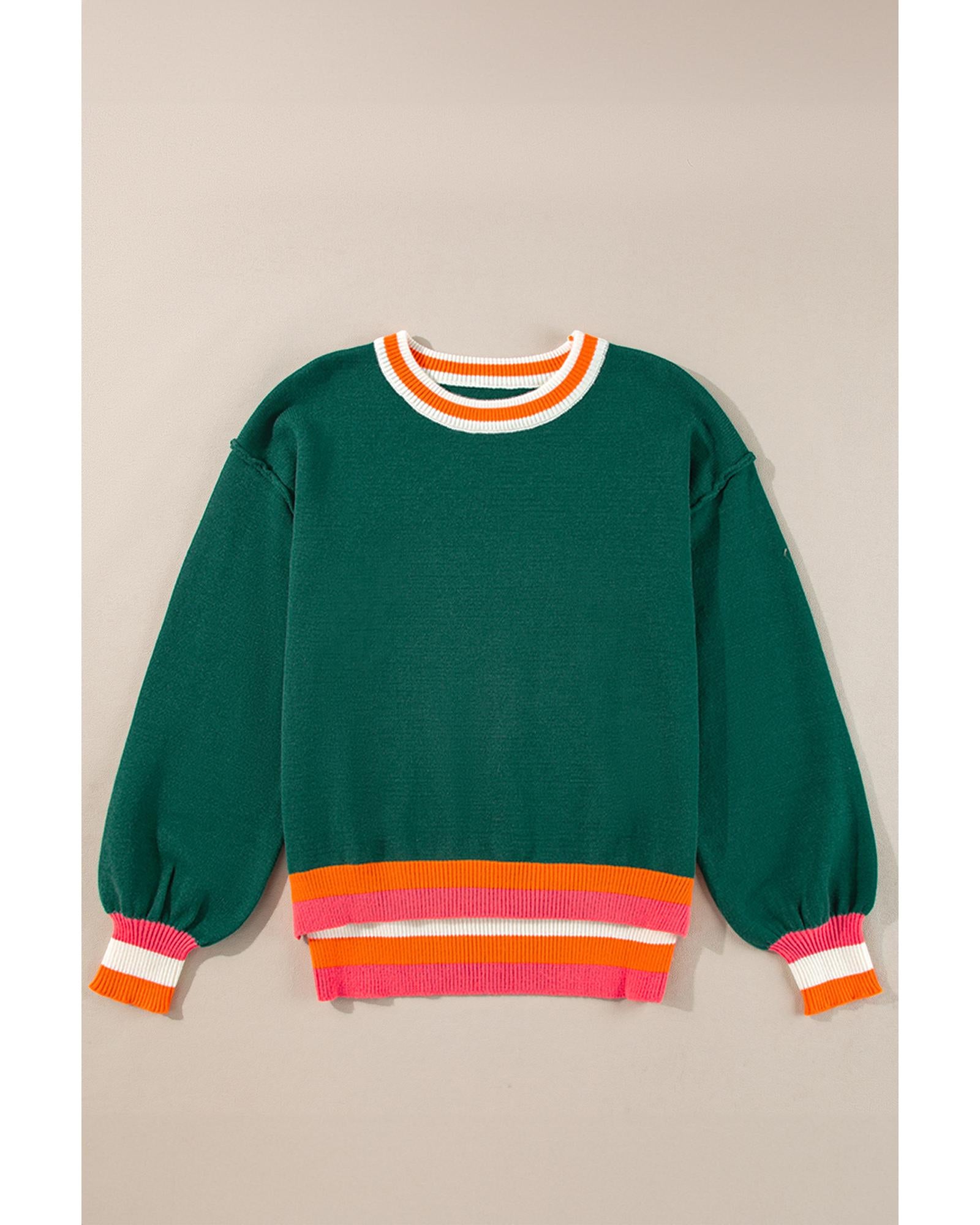 Blackish Green Colorblock Striped Trim Drop Shoulder Sweater - L