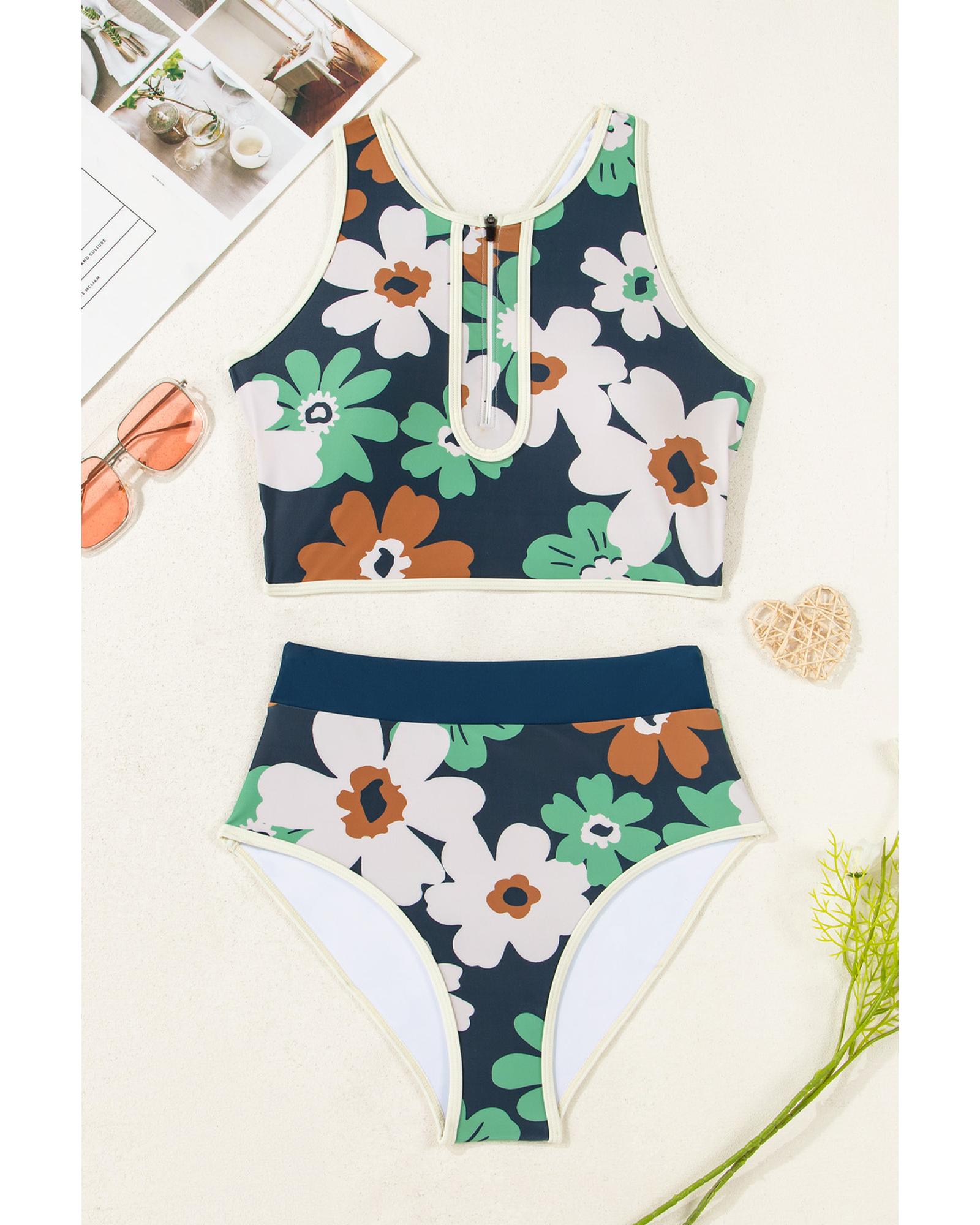 Blue Flower Zip up Racerback High Waisted Bikini - M