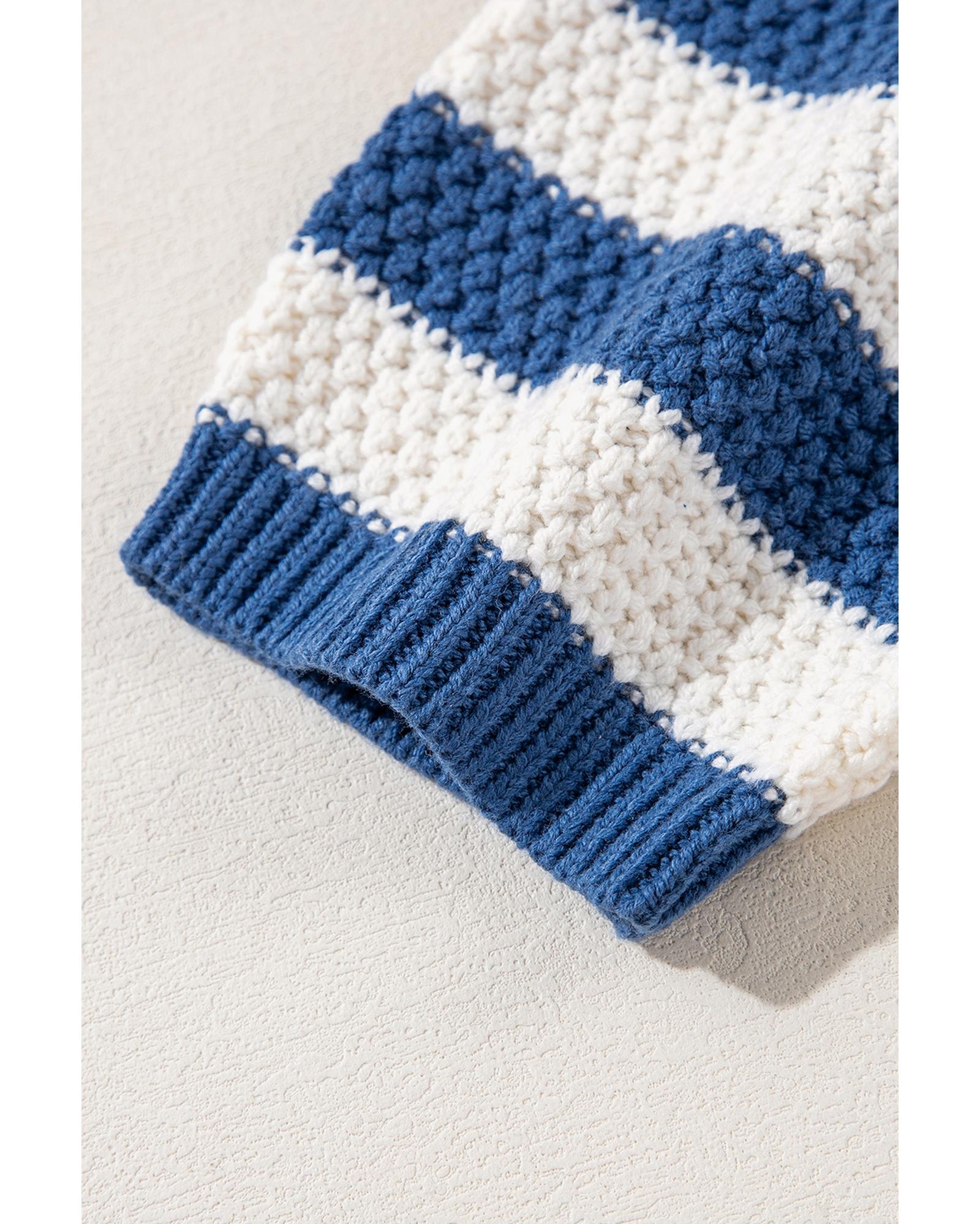 Blue Stripe V Neck Pocketed Drawstring Hooded Sweater - M