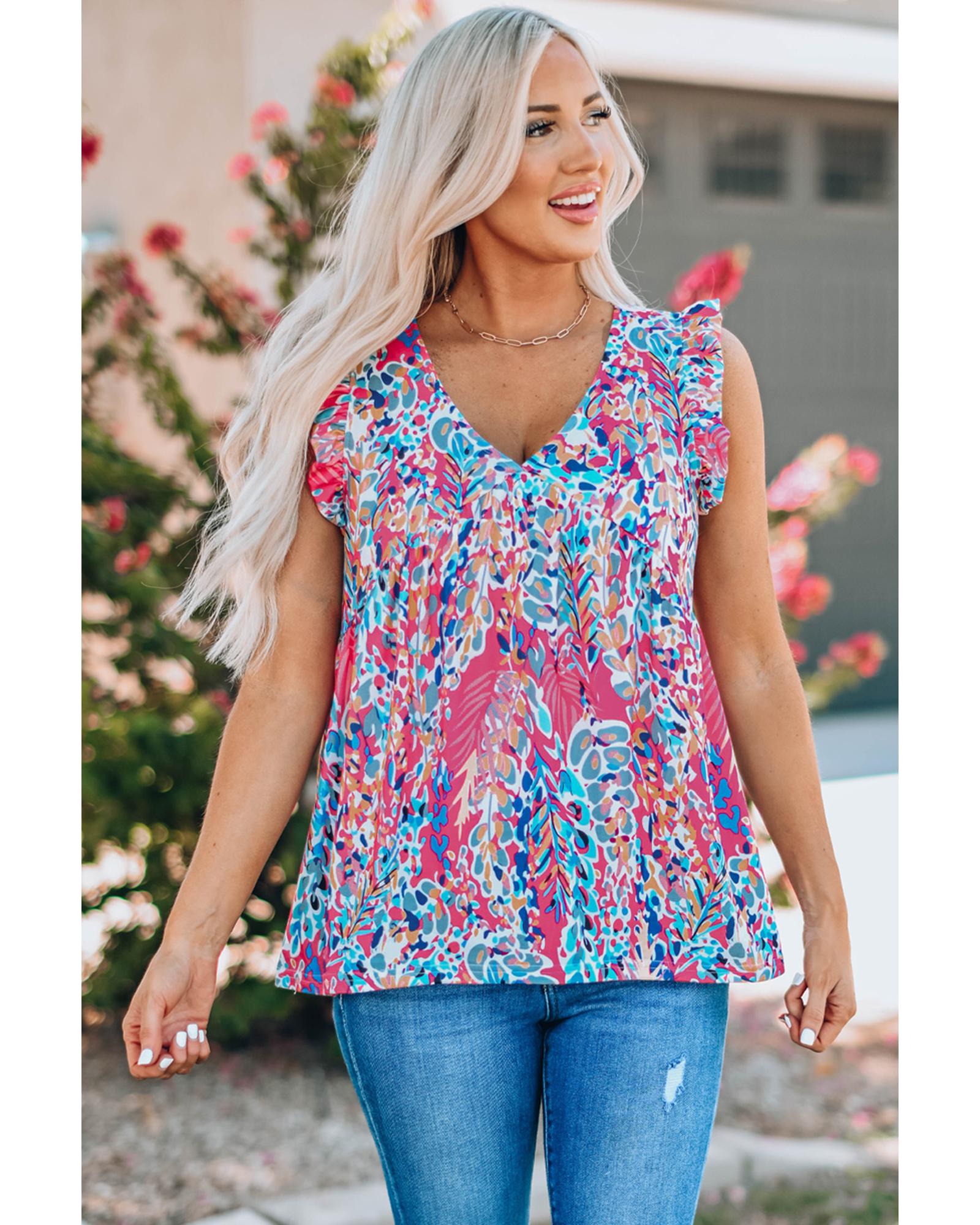 Boho Pattern Print Flounce V Neck Tank Top - M