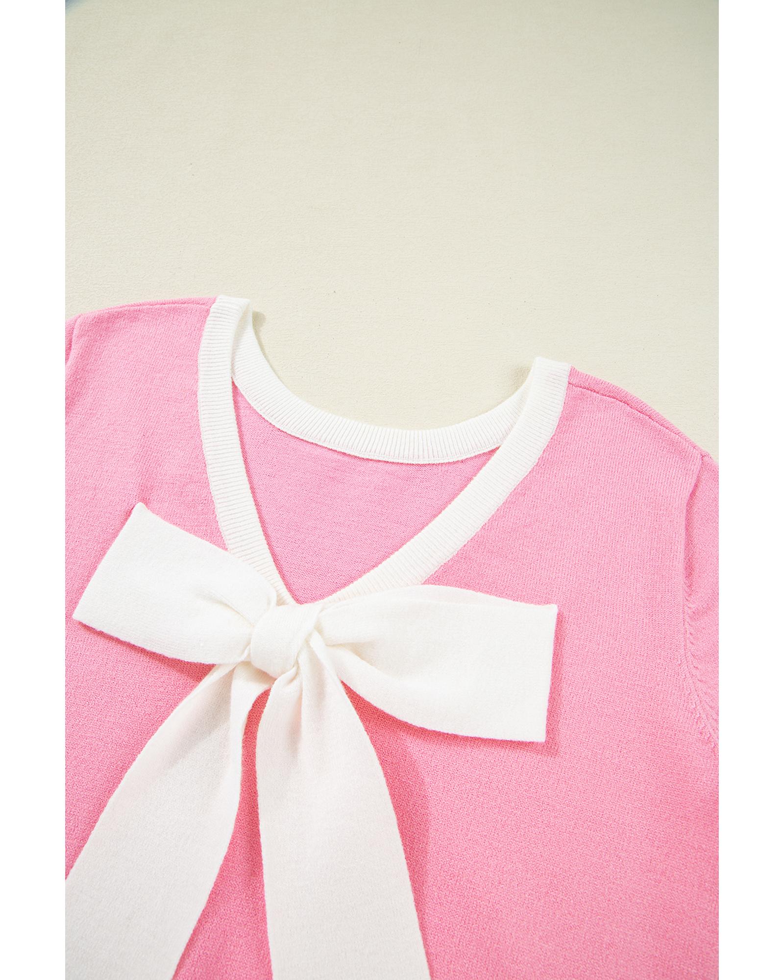 Bonbon Colorblock Bow V-Shape Cut Back Short Sleeve Sweater - L