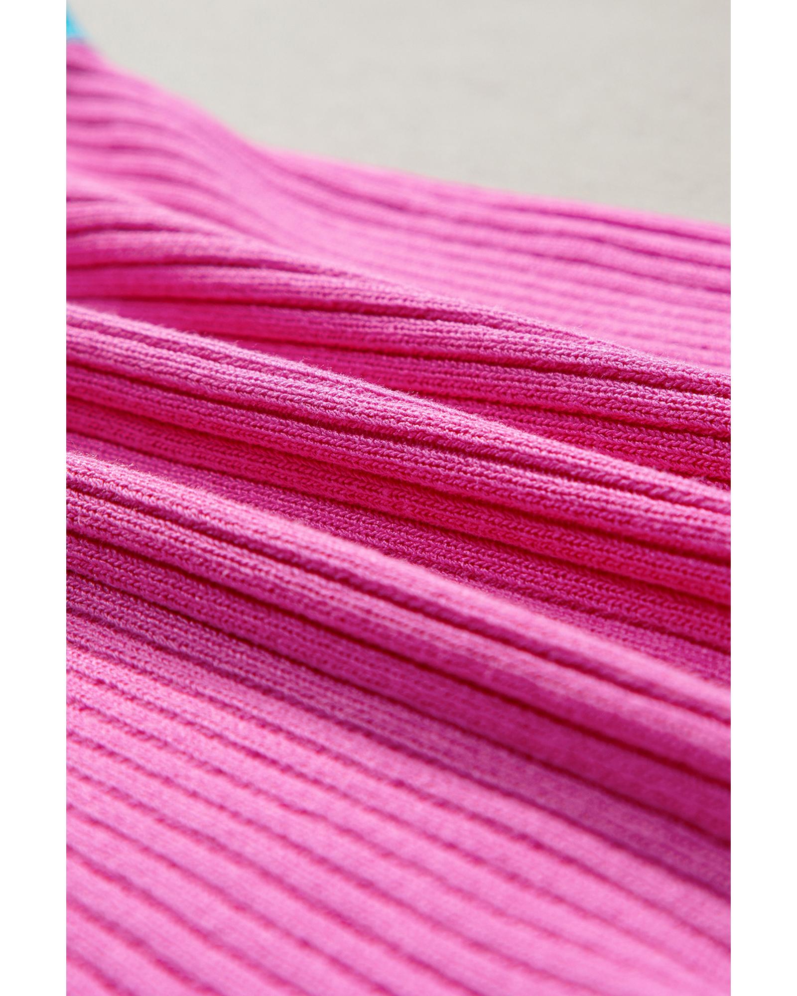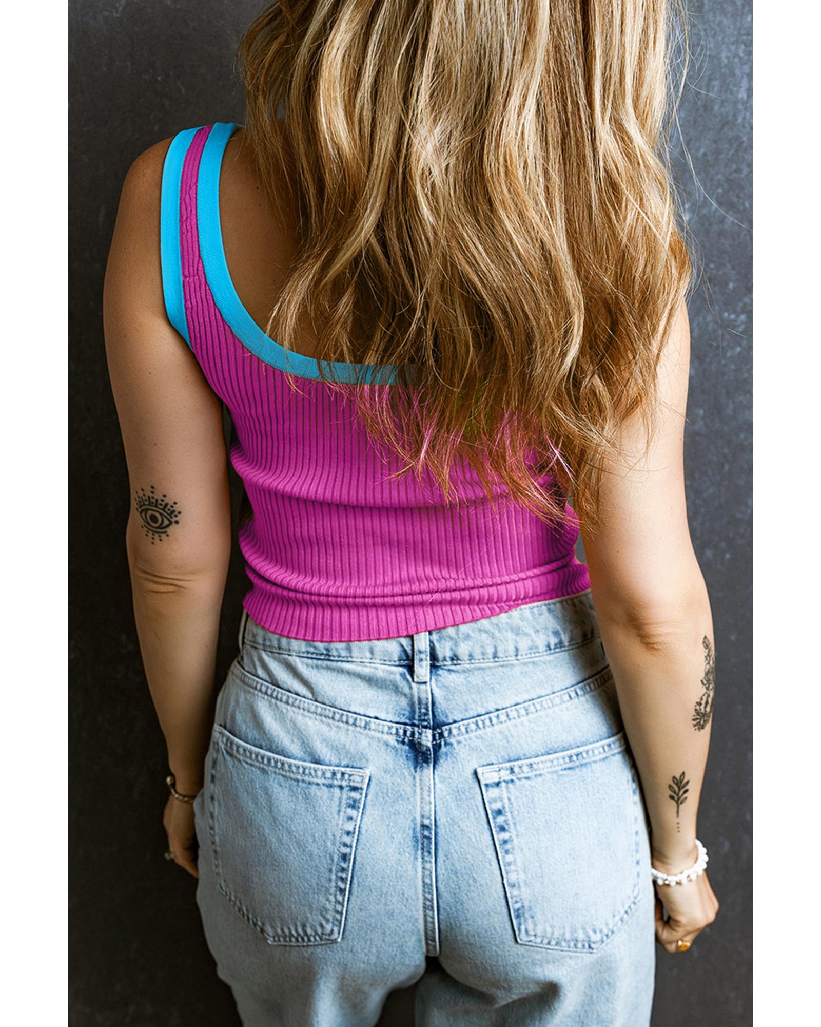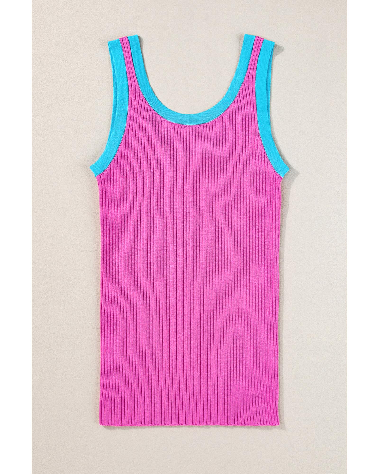 Bright Pink Colorblock Edge Ribbed Knit U Neck Tank Top - L