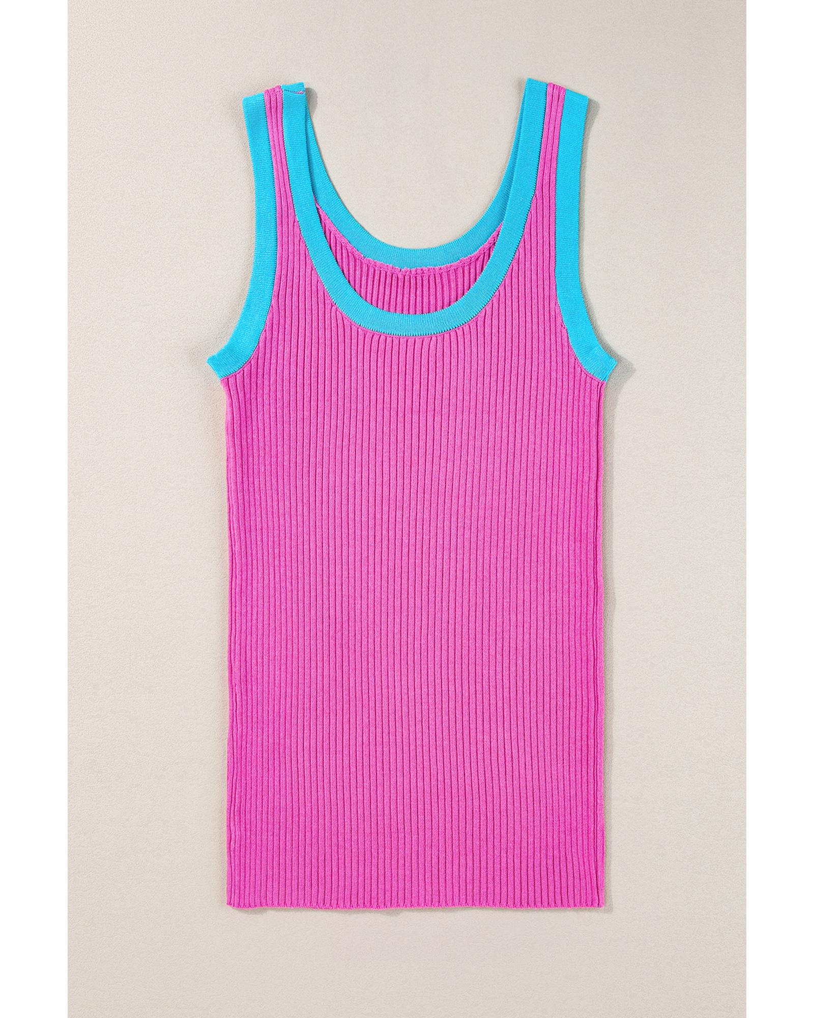 Bright Pink Colorblock Edge Ribbed Knit U Neck Tank Top - M