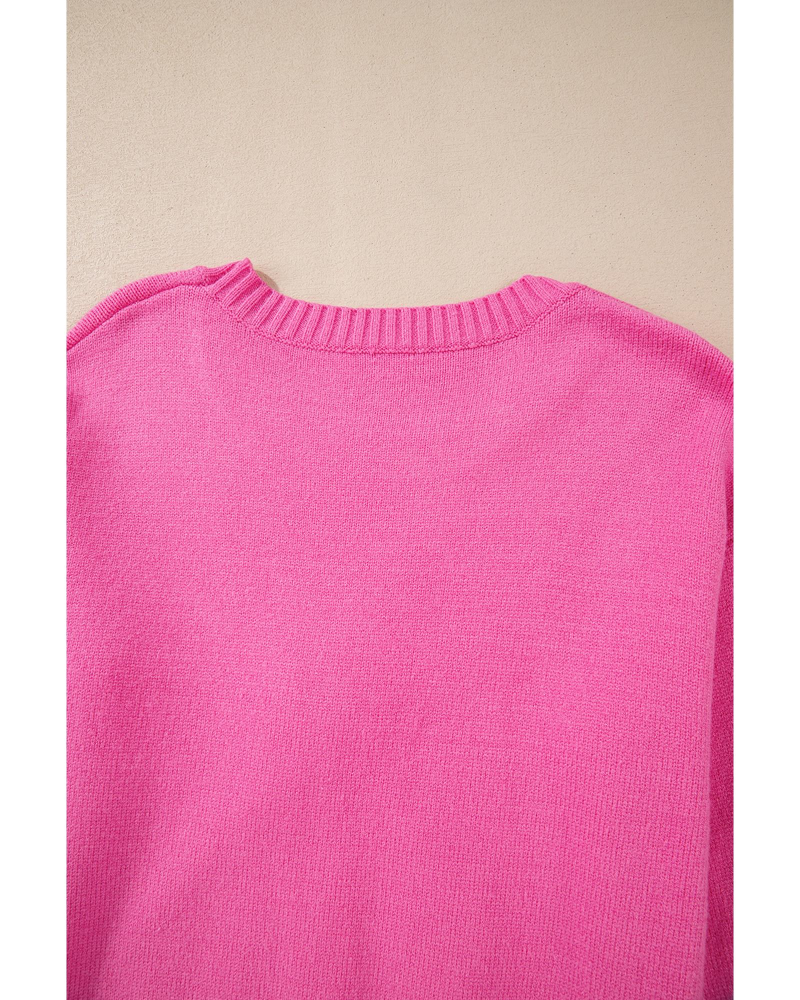 Bright Pink Corded Flower Bow Ribbed Trim Casual Sweater - L