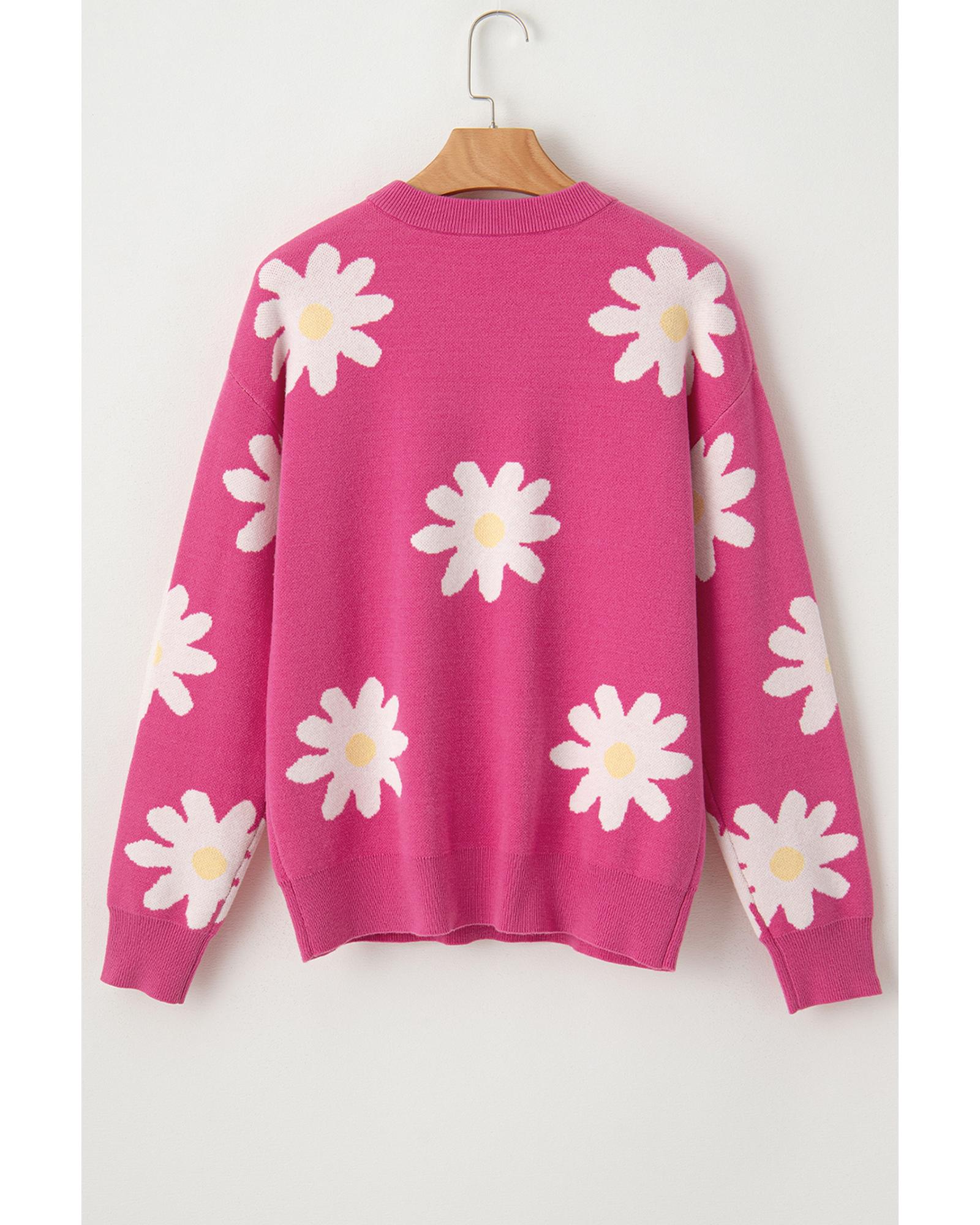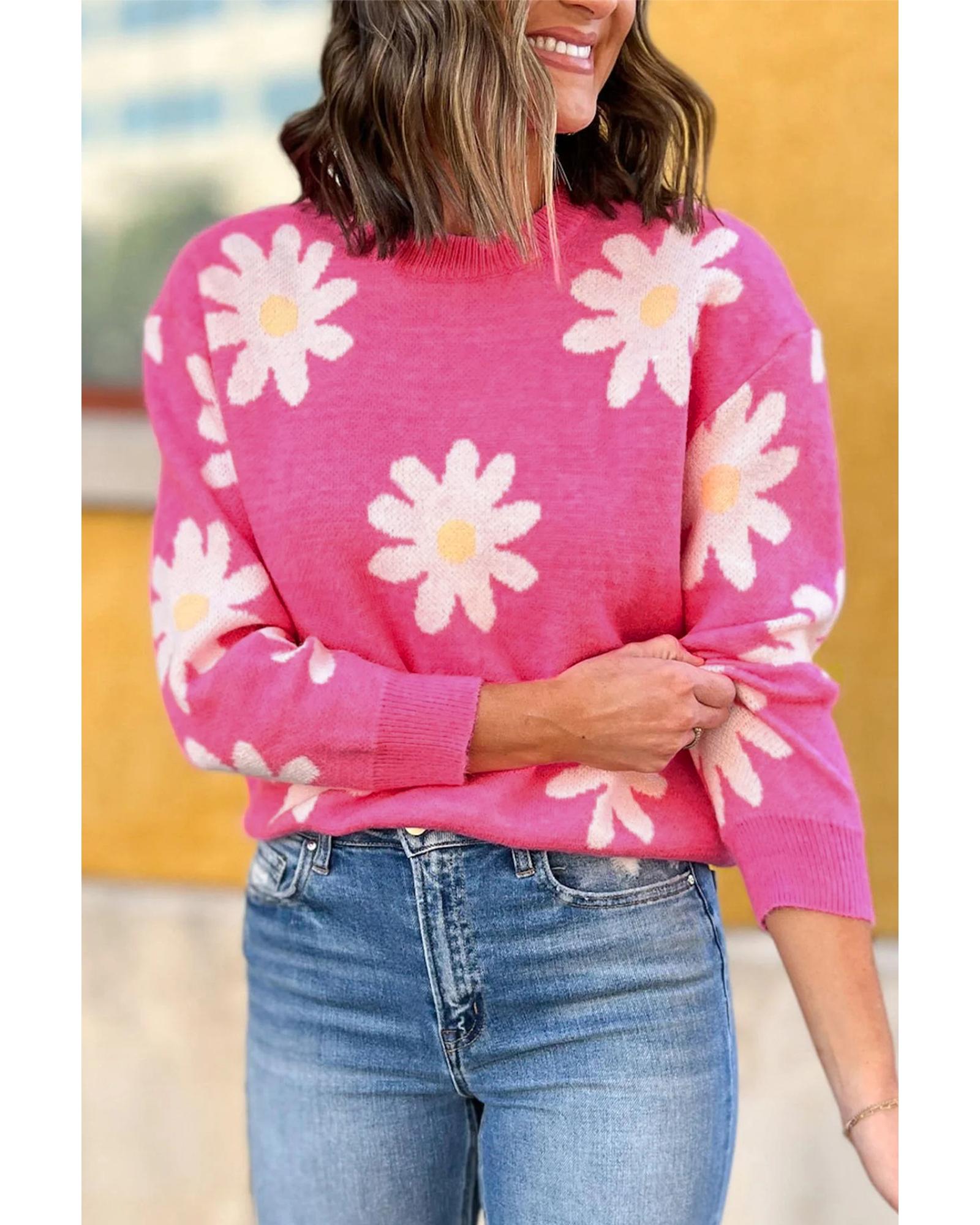 Bright Pink Daisy Flower Crew Neck Long Sleeve Sweater - L