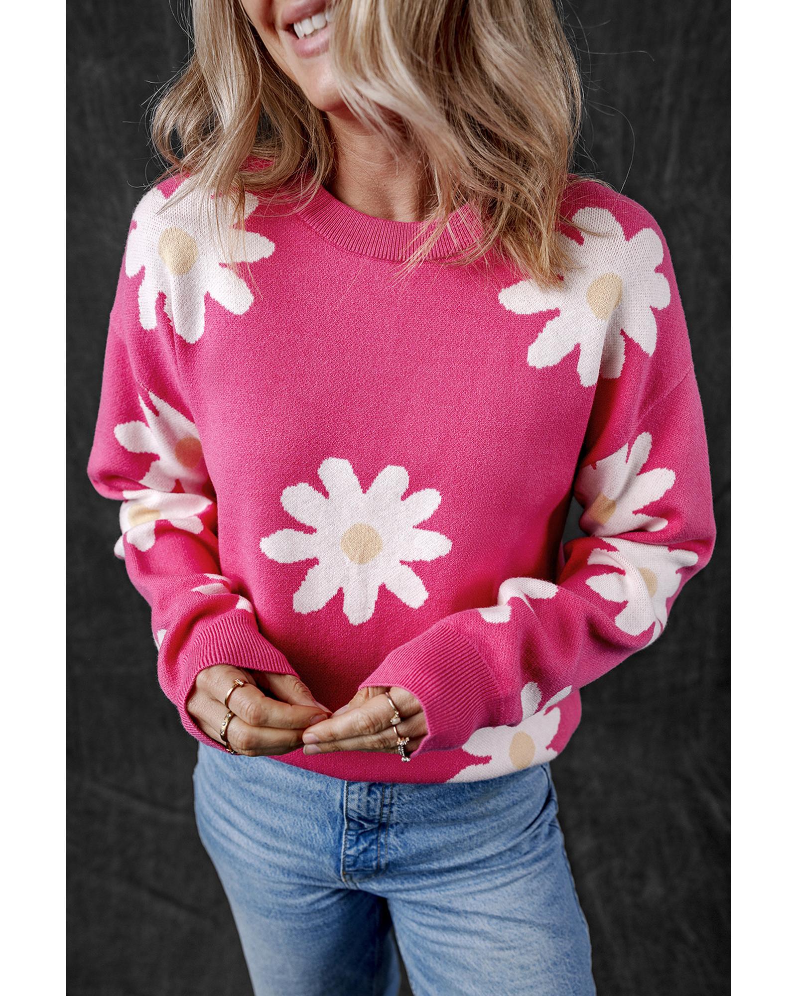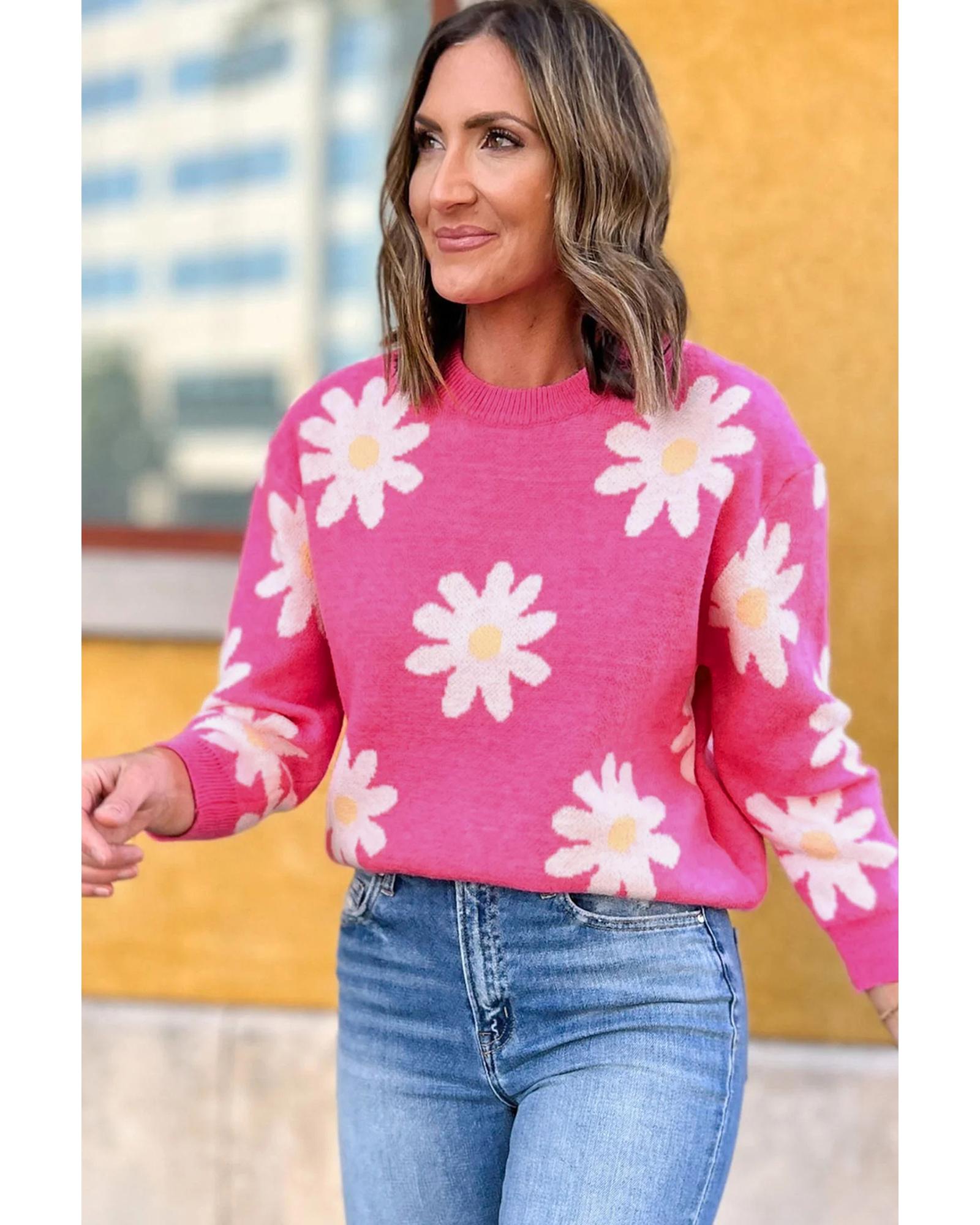Bright Pink Daisy Flower Crew Neck Long Sleeve Sweater - M
