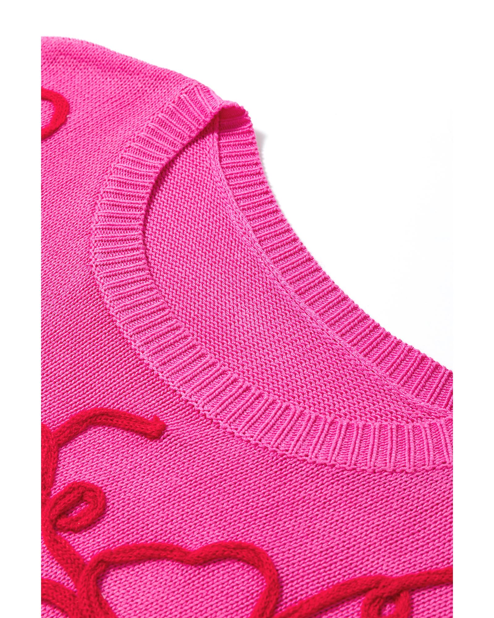 Bright Pink Flower Embroidery Short Sleeve Knitwear Top - XL