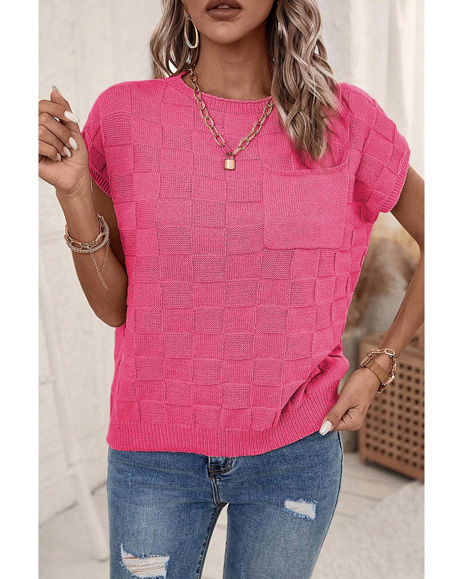 Bright Pink Lattice Textured Knit Short Sleeve Sweater - 2XL