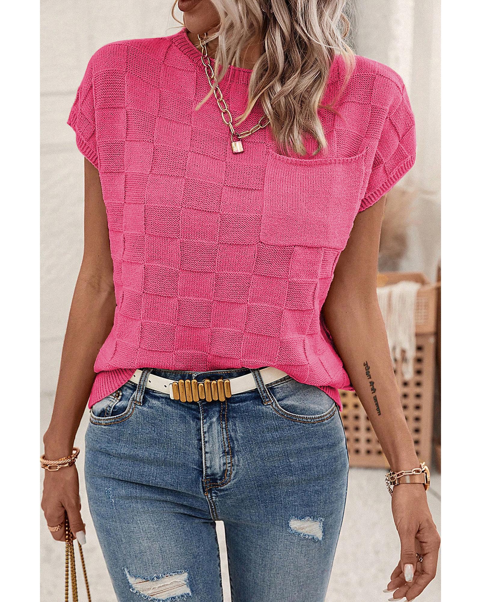 Bright Pink Lattice Textured Knit Short Sleeve Sweater - M