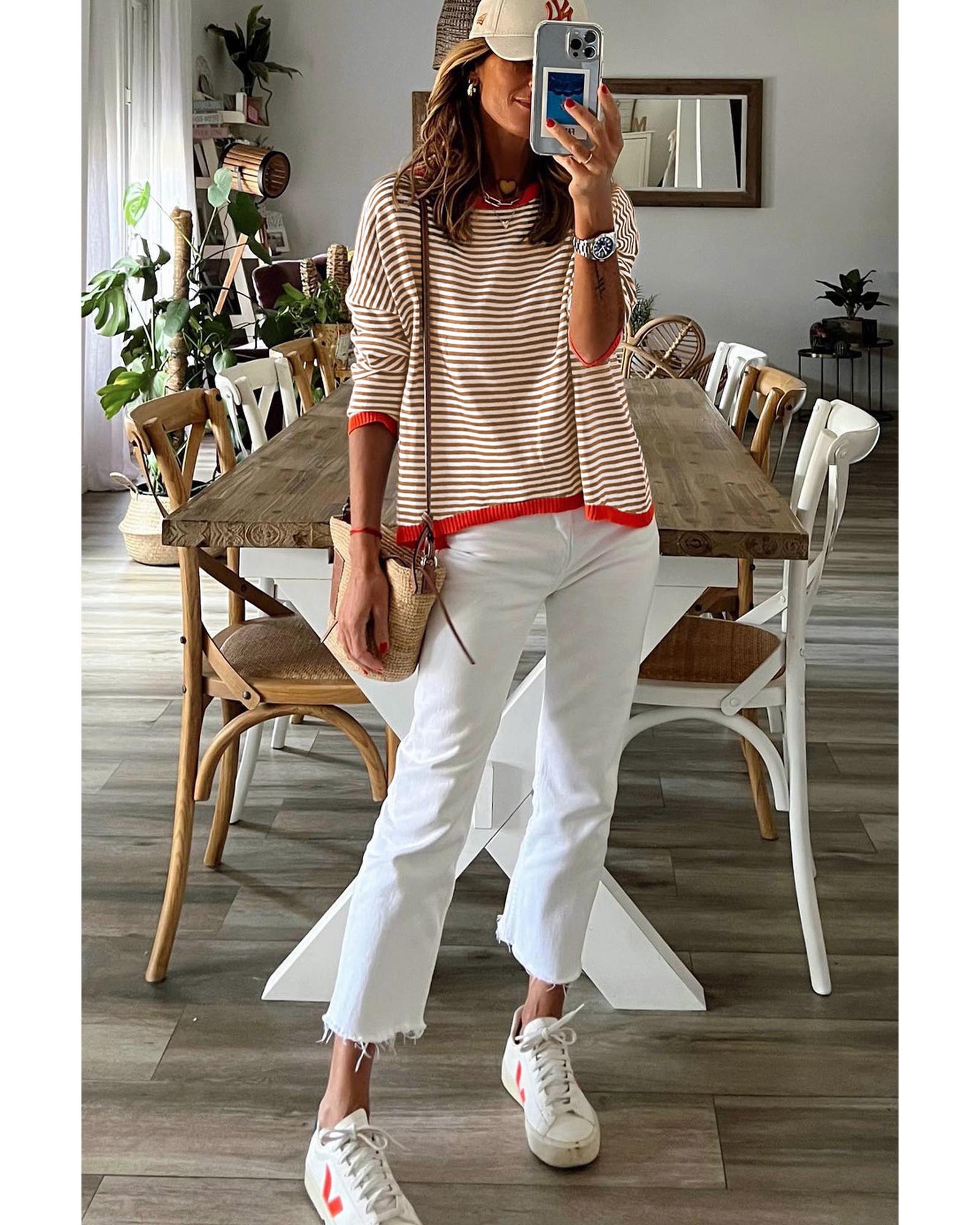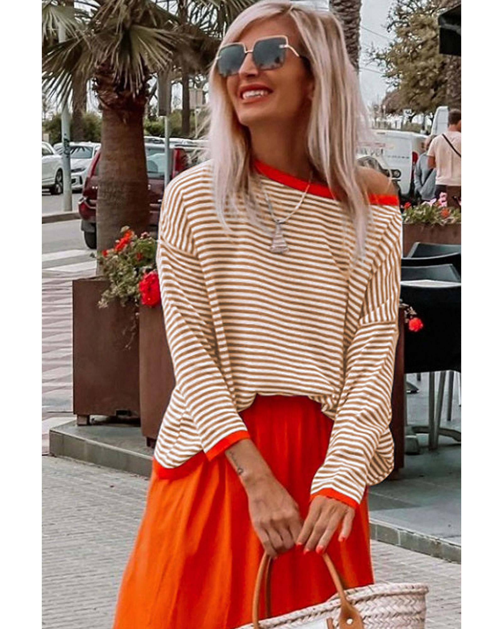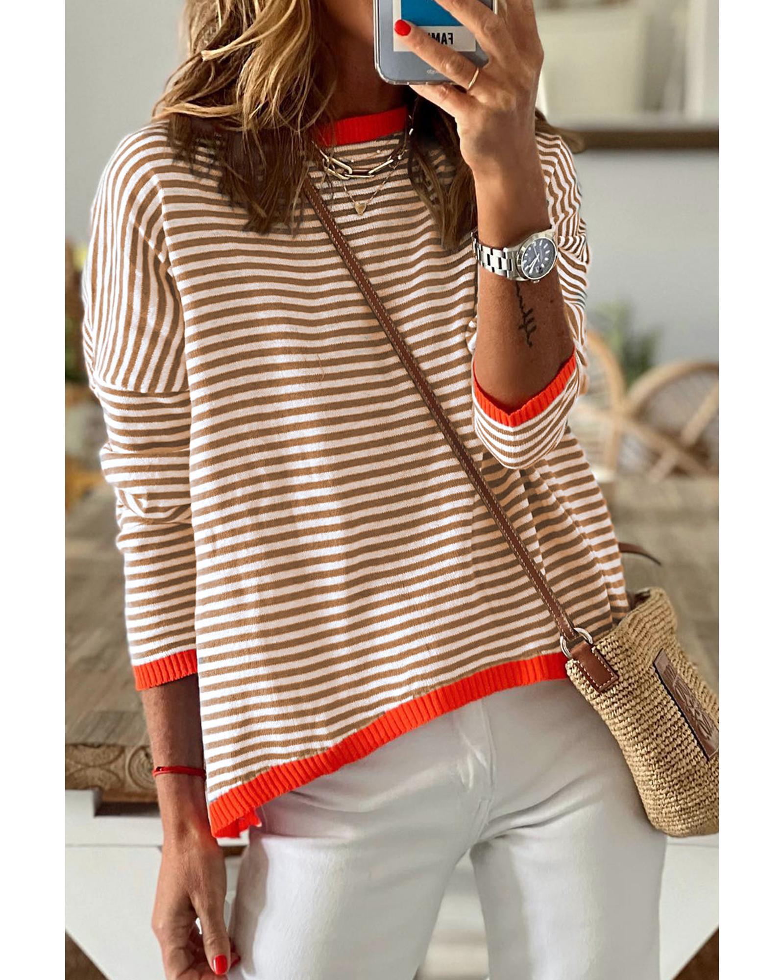 Brown Contrast Trimmed Striped Drop Shoulder Sweater - XL