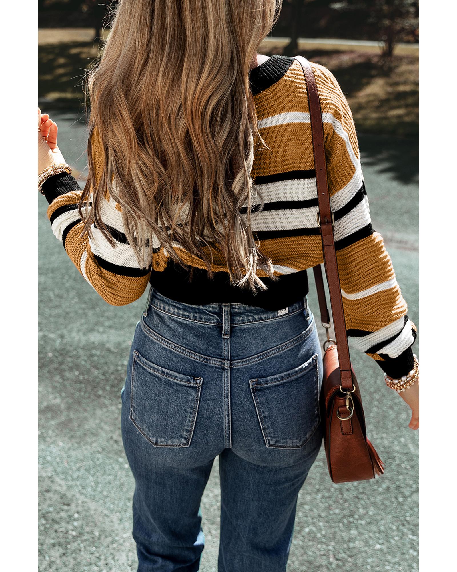 Brown Stripe Contrast Stripes V Neck Textured Knit Sweater - XL
