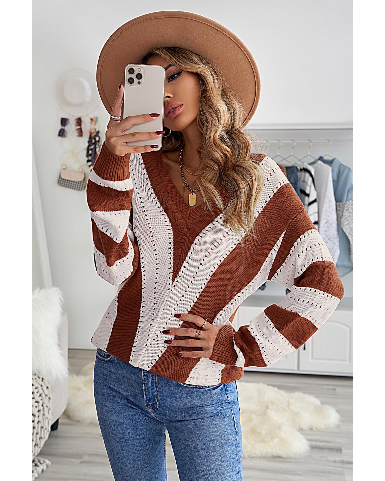 Brown Striped Colorblock V Neck Knitted Sweater - M