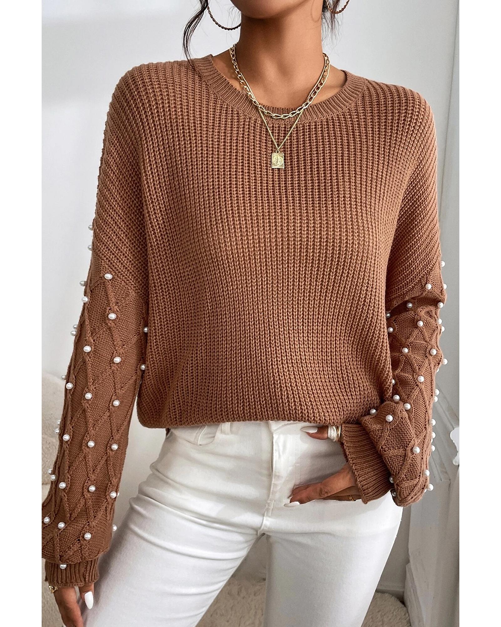 Chestnut Beaded Drop Shoulder Round Neck Sweater - S