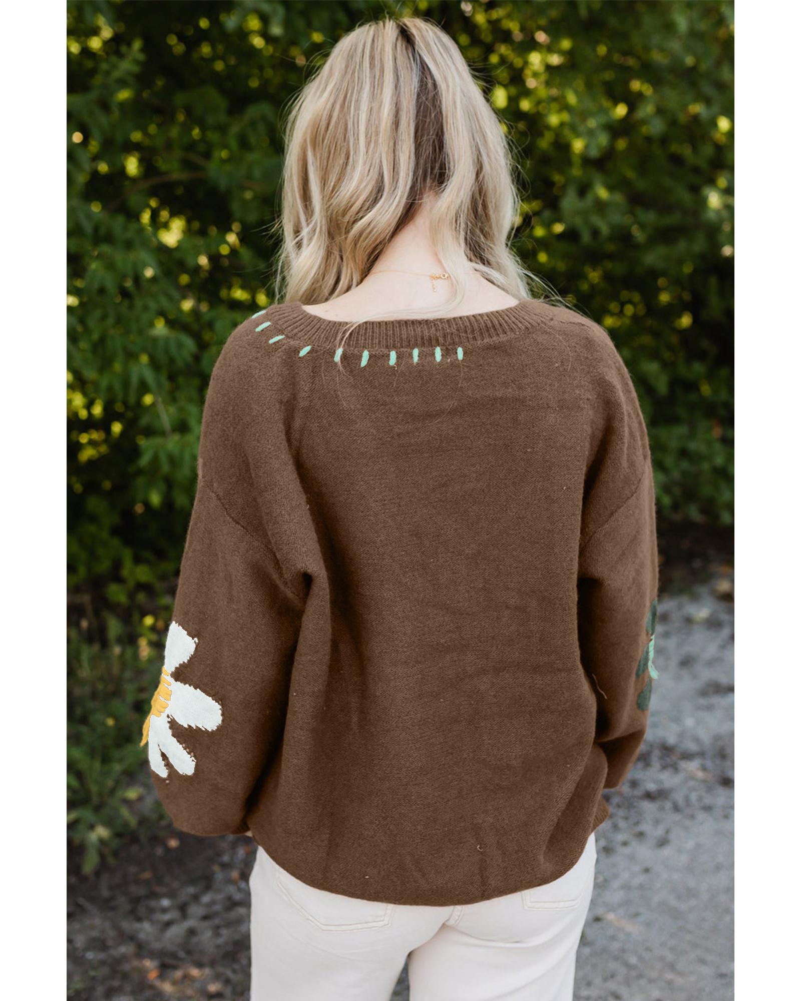 Coffee Big Flower Pattern V Neck Drop Shoulder Sweater - L