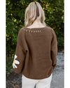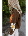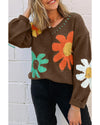 Coffee Big Flower Pattern V Neck Drop Shoulder Sweater - M