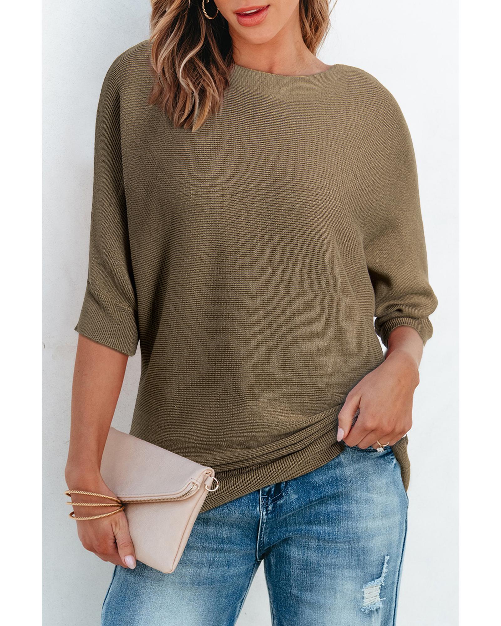 Coffee Round Neck Half Sleeve Ribbed Knit Top - XL