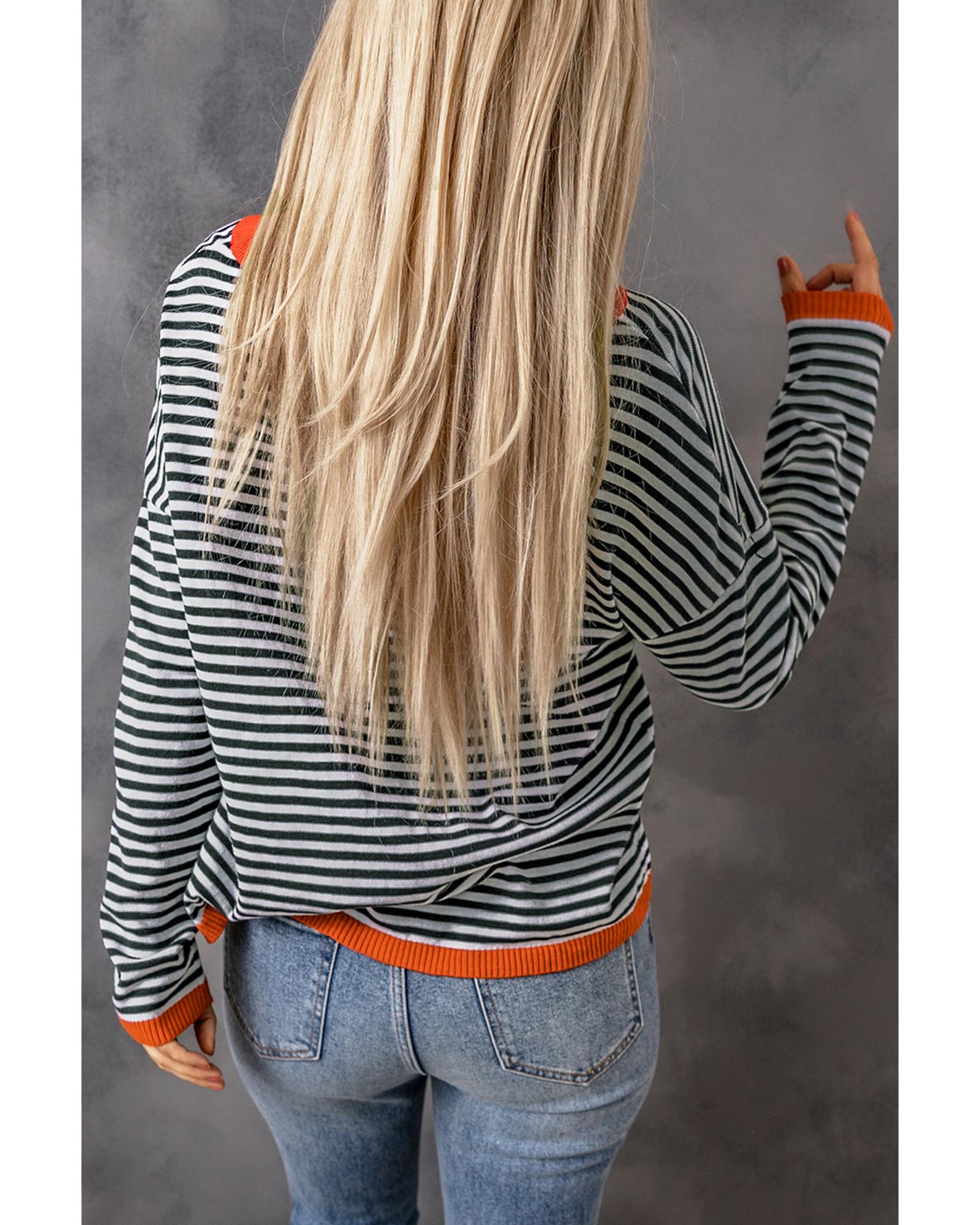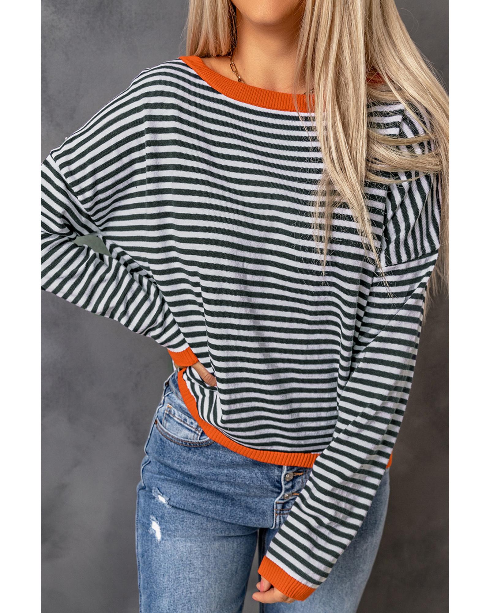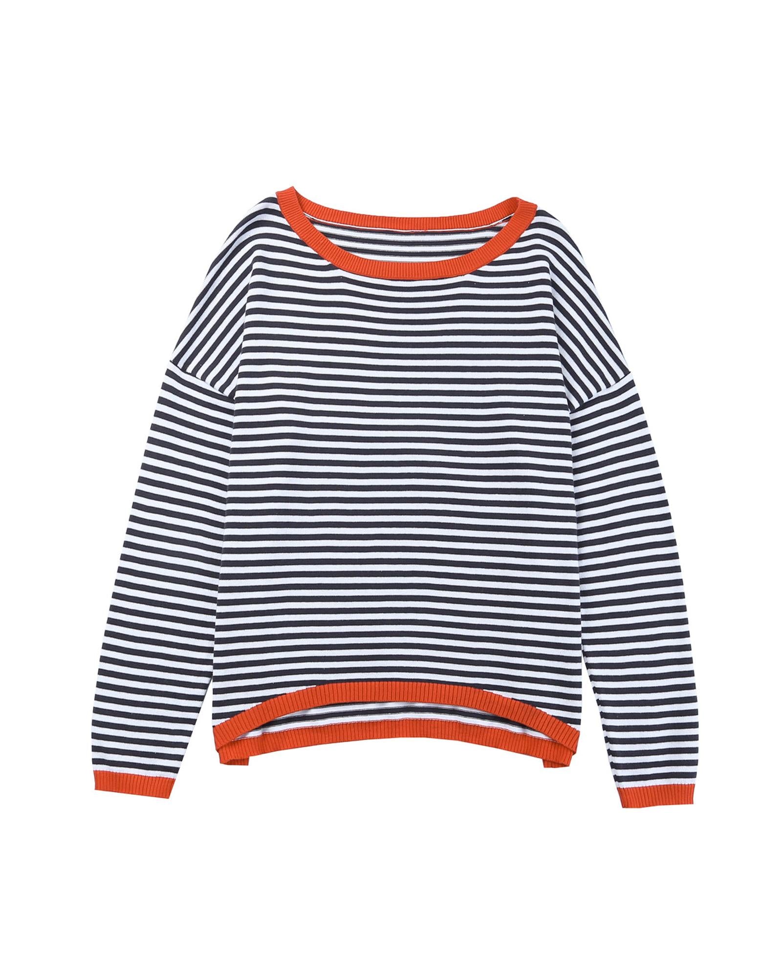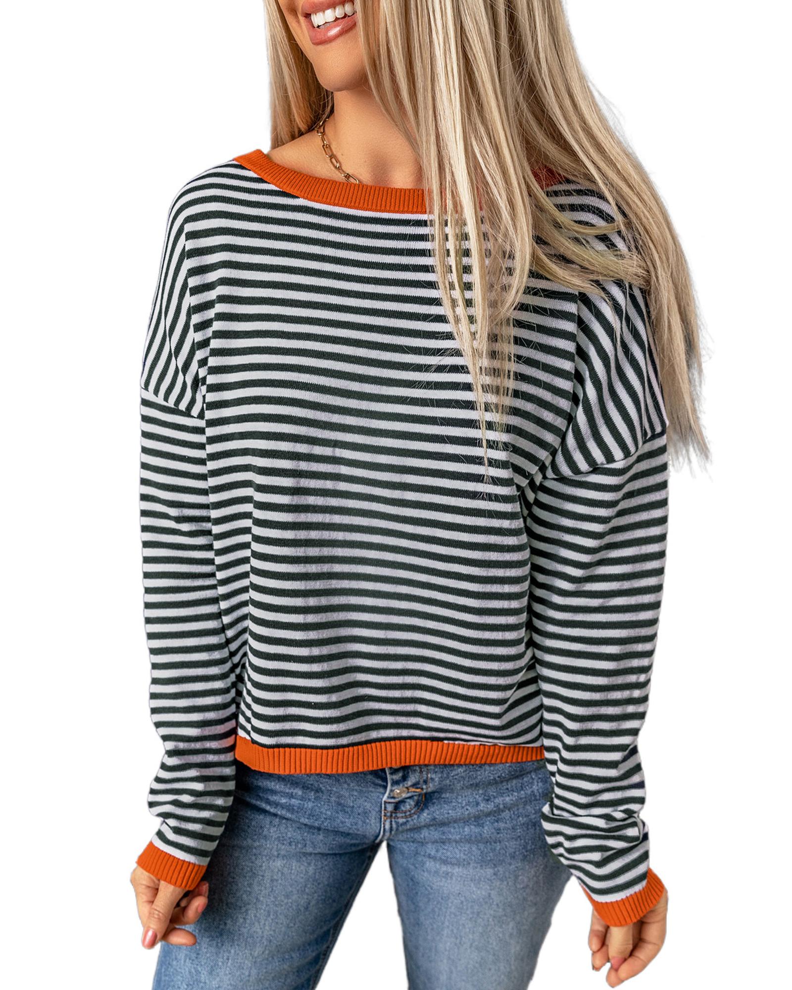 Contrast Trimmed Striped Drop Shoulder Sweater - M