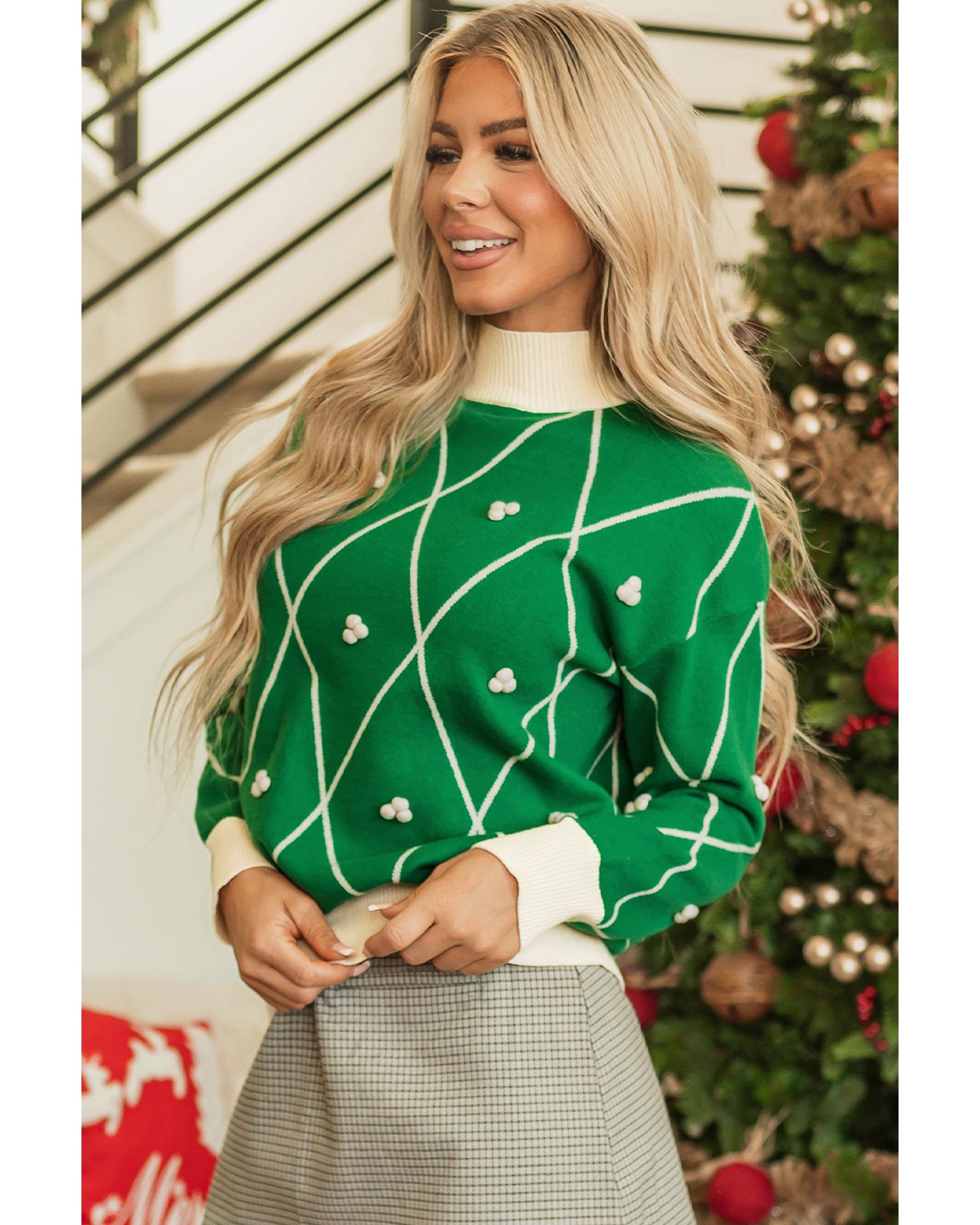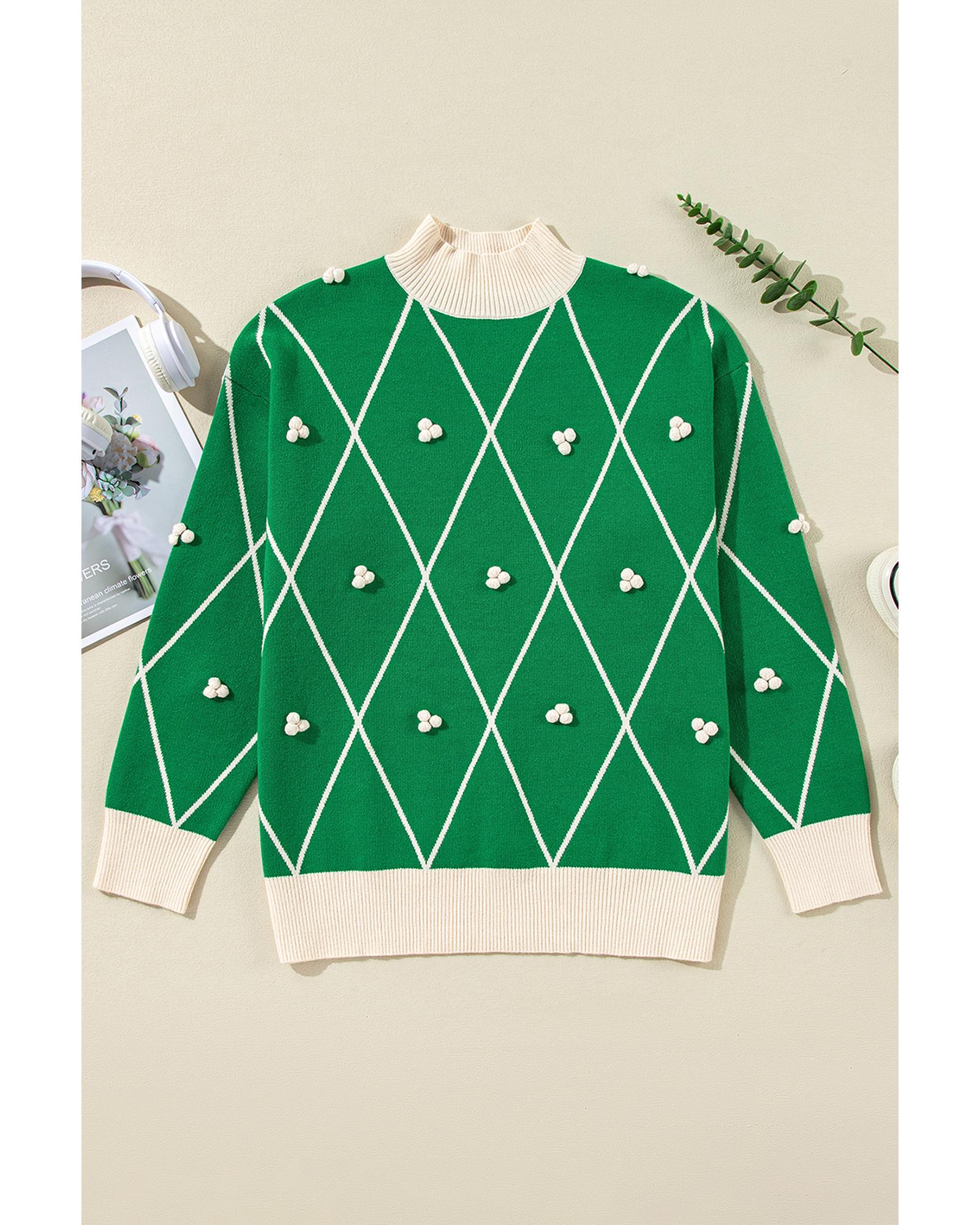 Dark Green Diamond Pattern Pom Accents Contrast Trim High Neck Sweater - XL