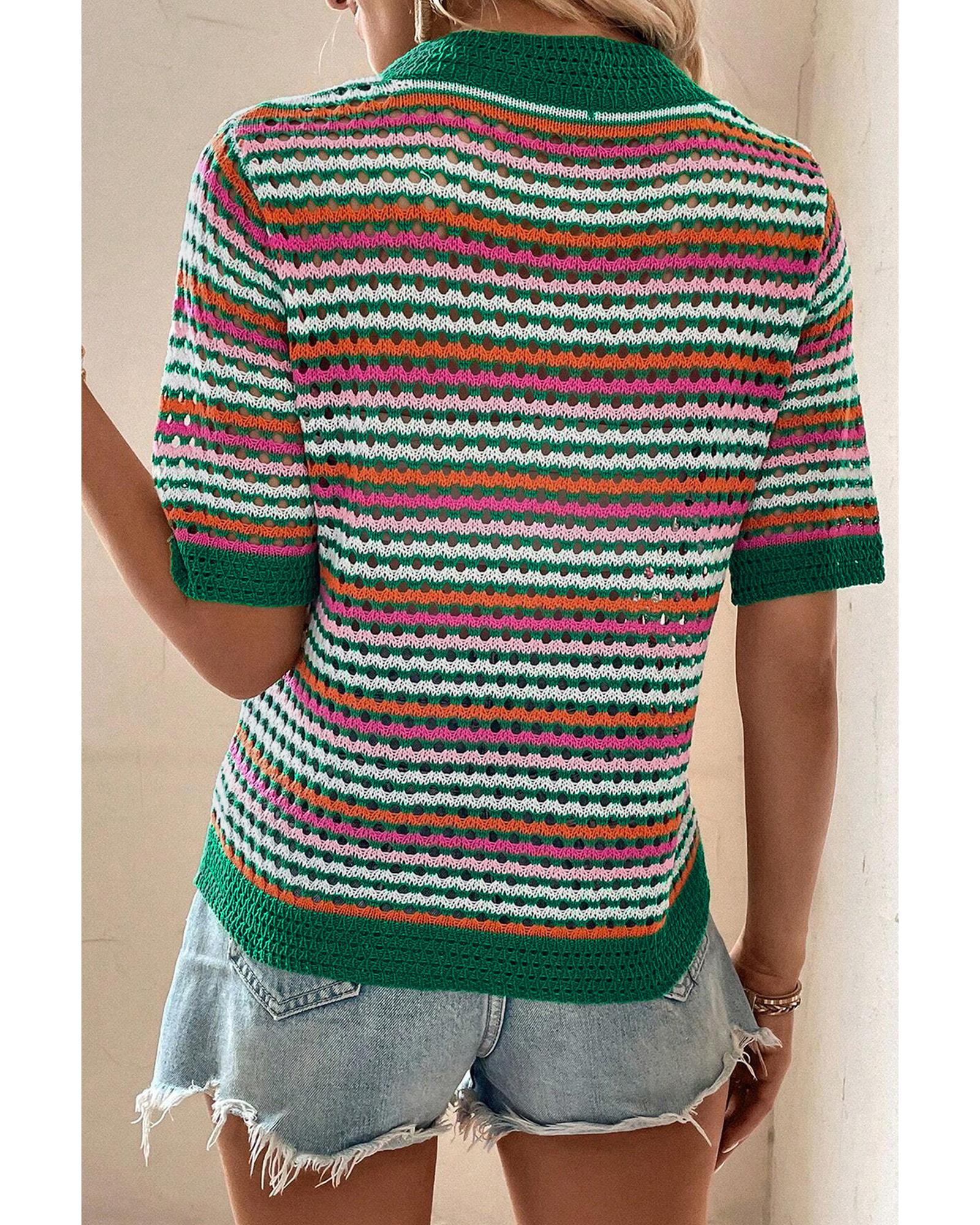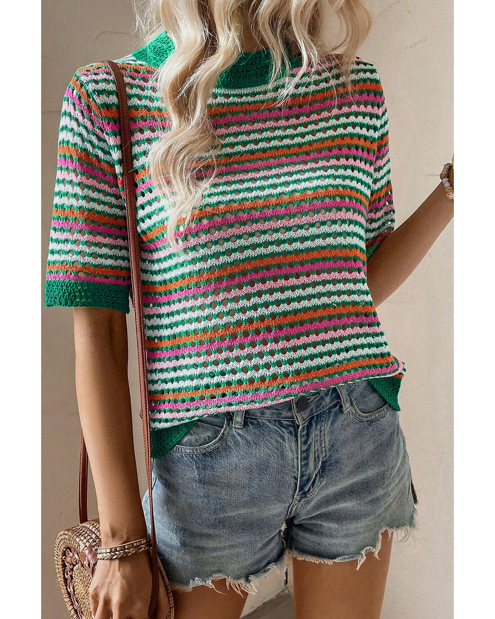 Dark Green Striped Pattern Contrast Trim Pointelle Knit T Shirt - XL
