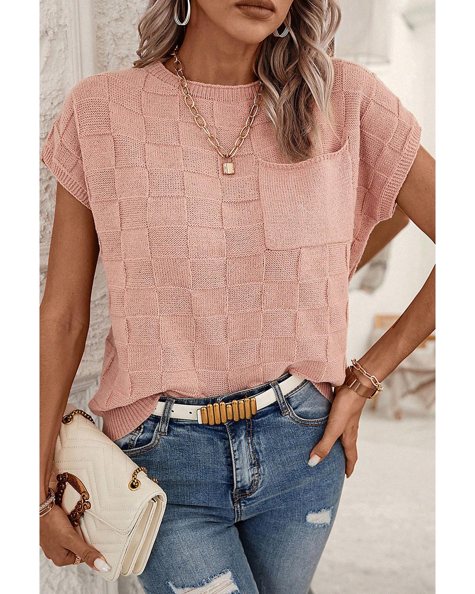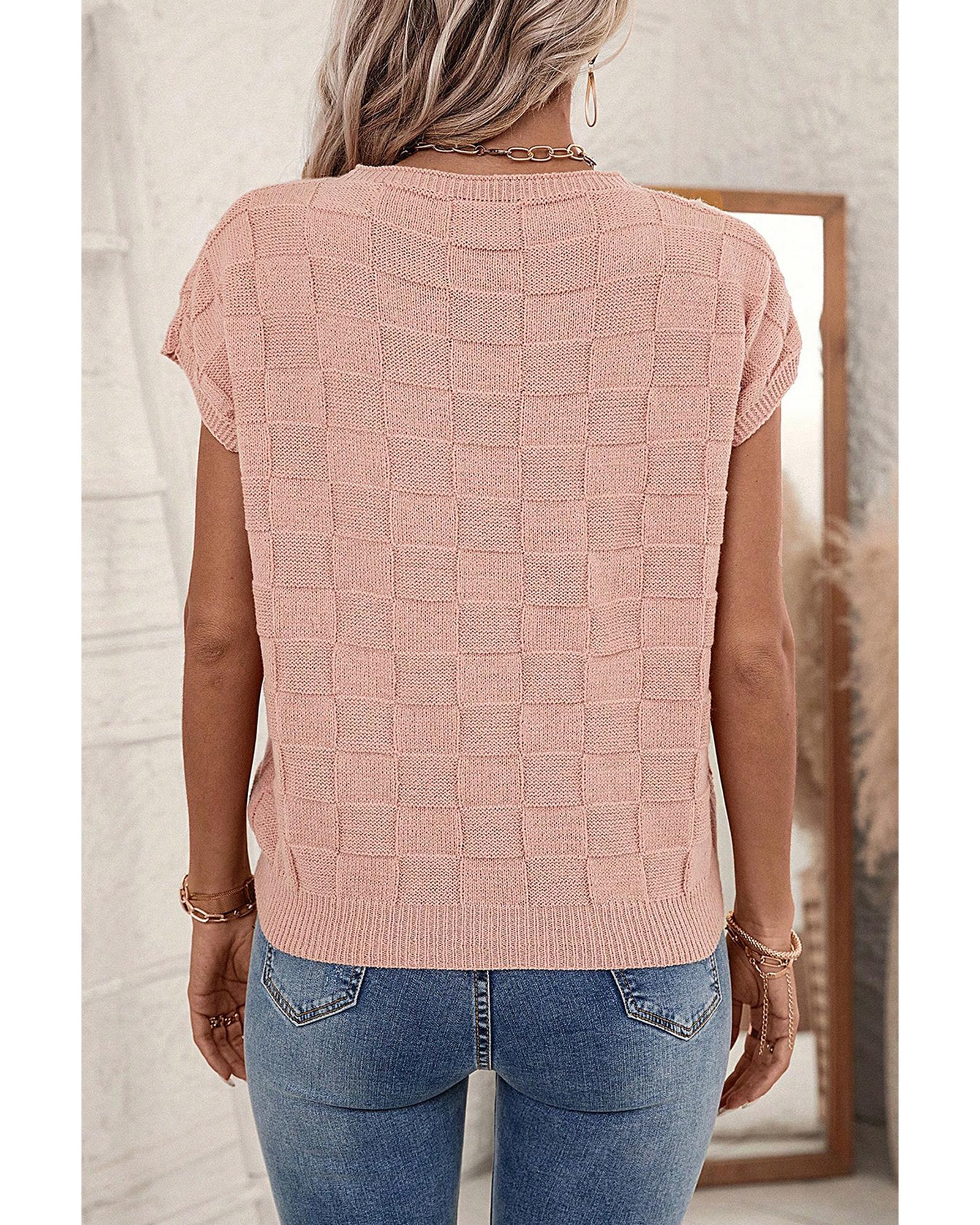 Dusty Pink Lattice Textured Knit Short Sleeve Sweater - L