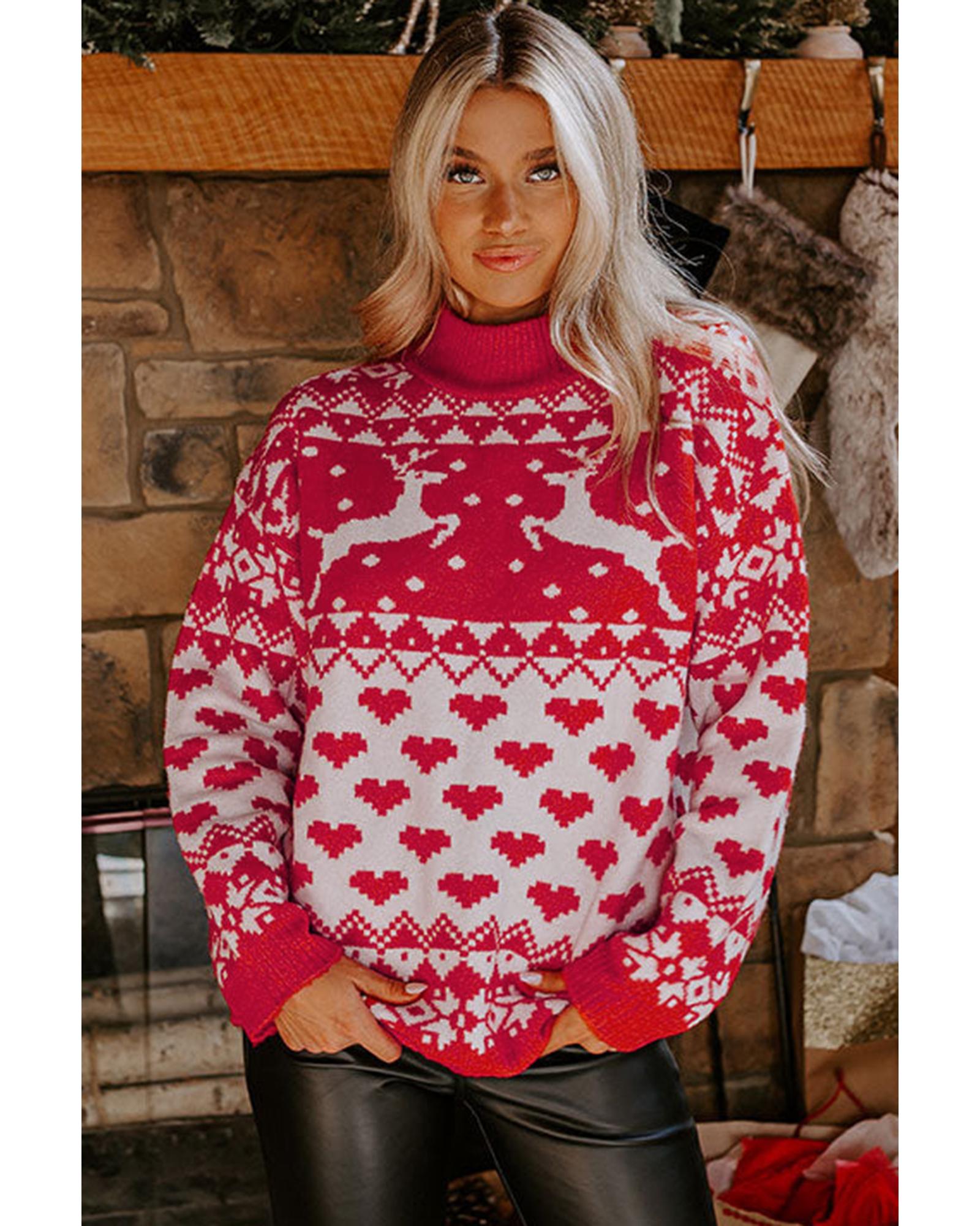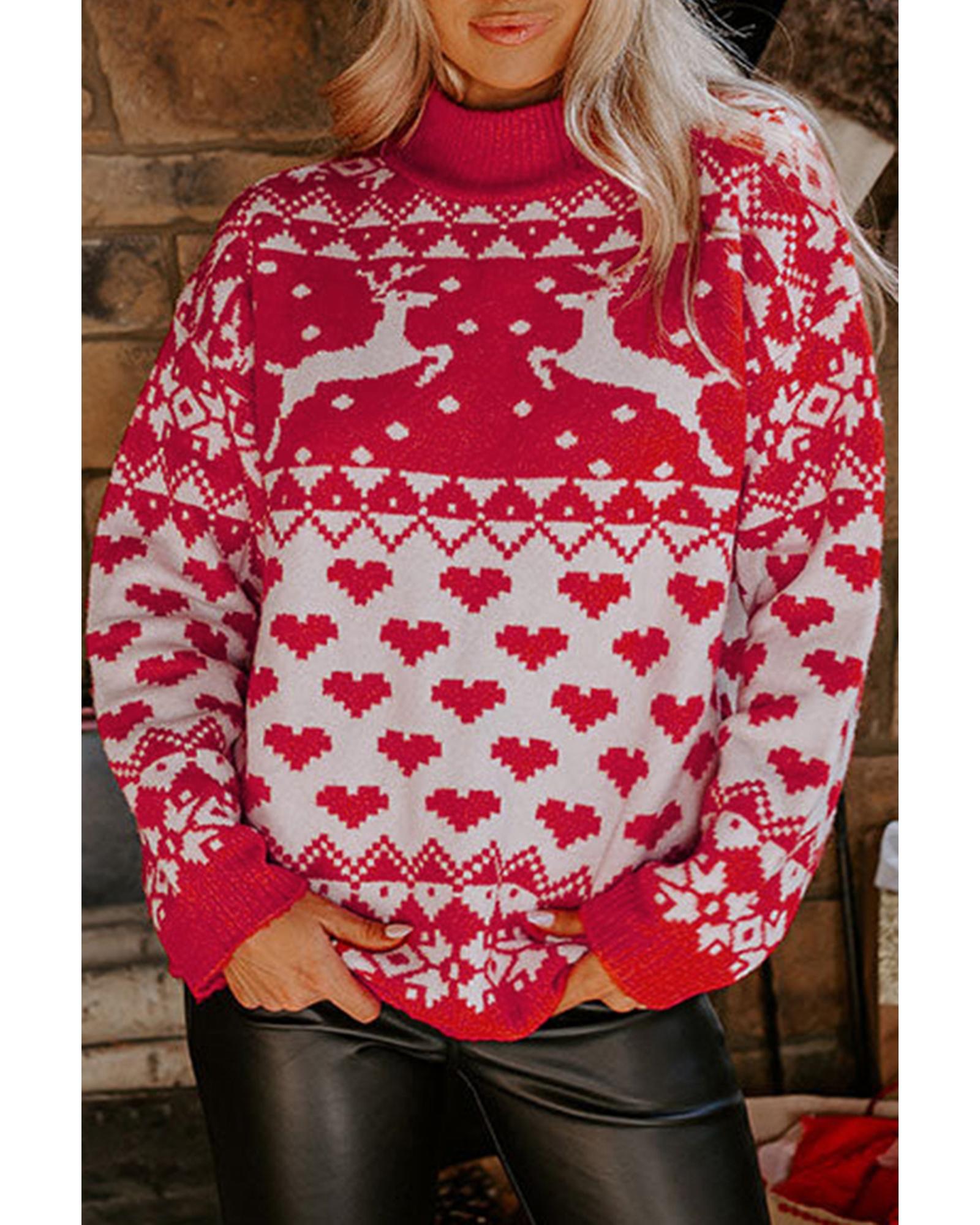 Fiery Red Merry Christmas Reindeer Heart Pattern High Neck Sweater - M