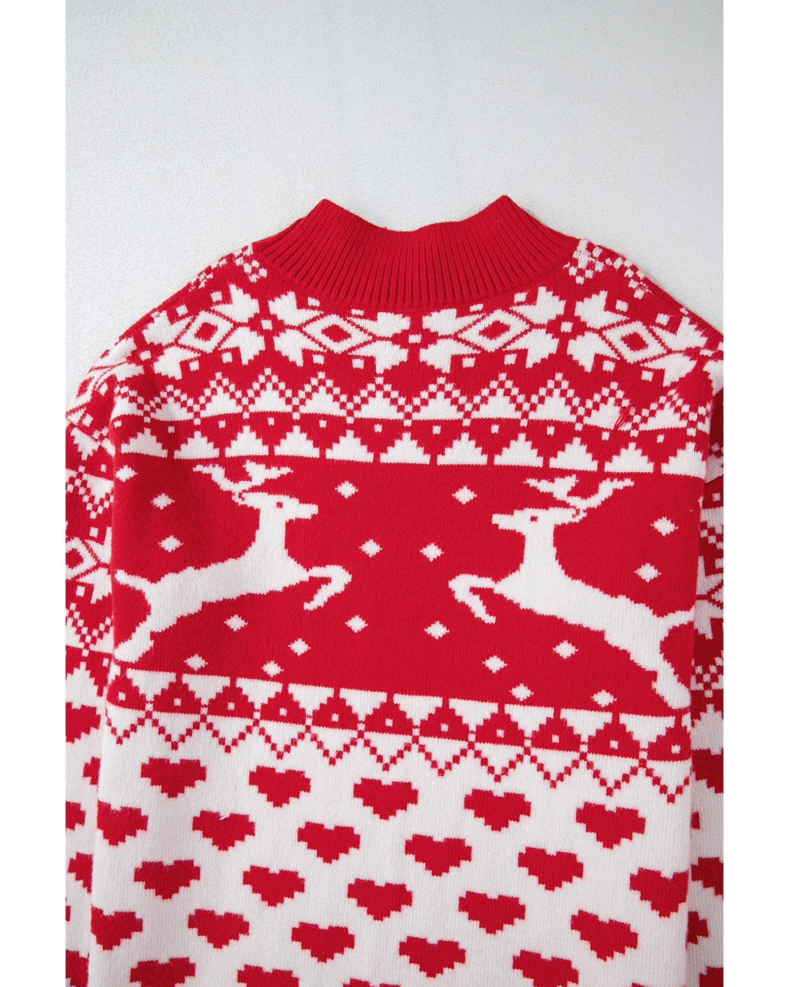 Fiery Red Merry Christmas Reindeer Heart Pattern High Neck Sweater - XL