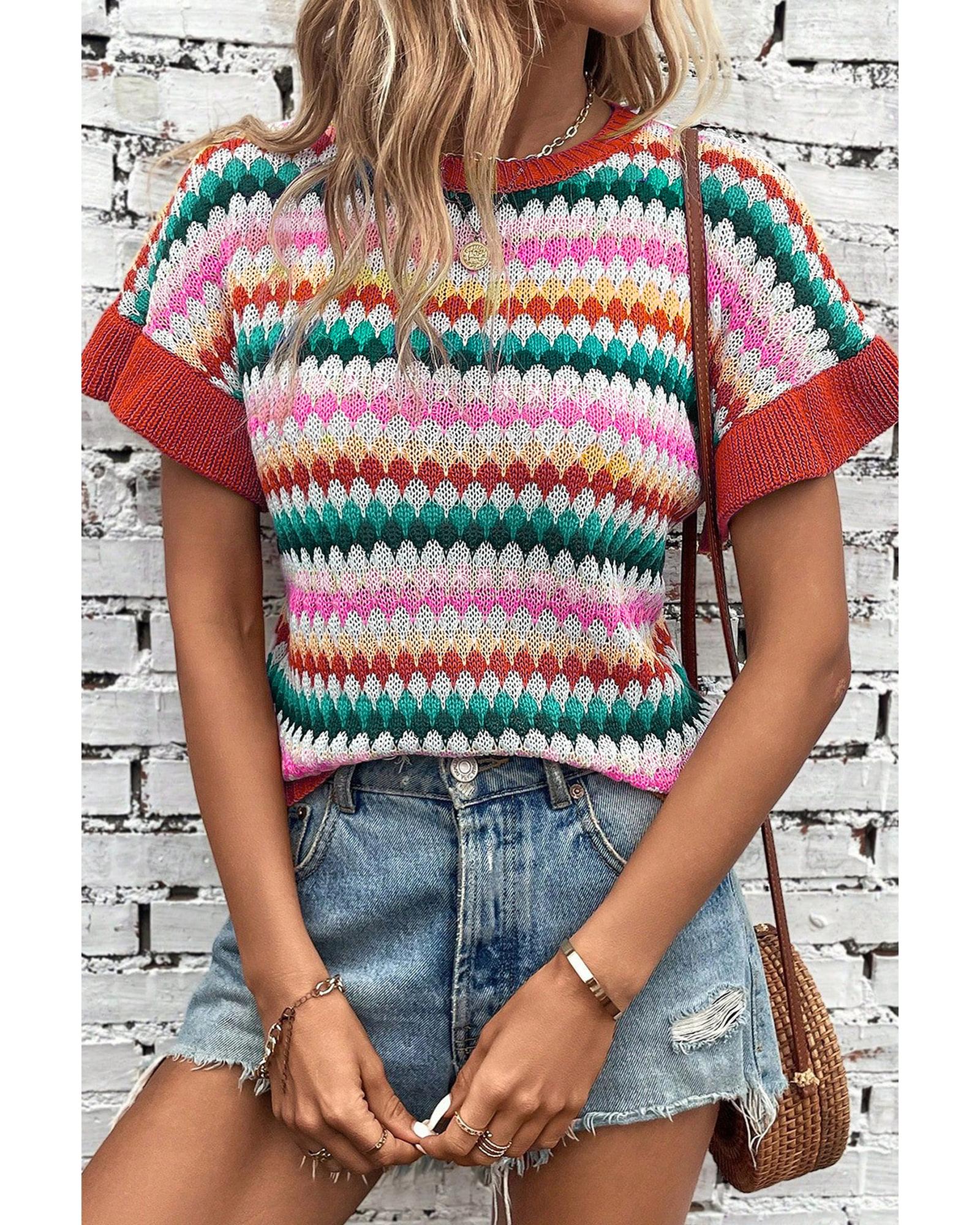 Fiery Red Trimmed Ruffle Sleeve Colorful Textured Sweater - M