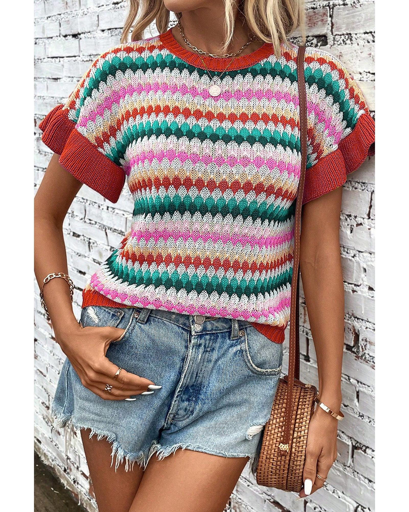 Fiery Red Trimmed Ruffle Sleeve Colorful Textured Sweater - XL