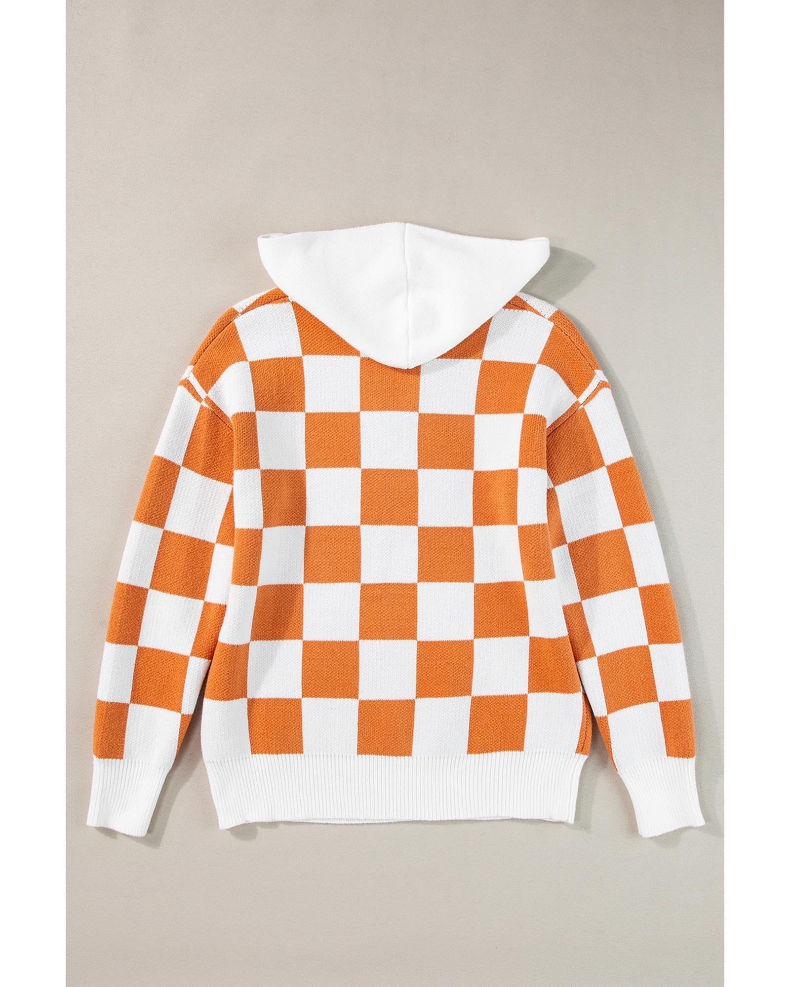 Gold Flame Checkered Split Neck Contrast Kangaroo Pocket Hooded Sweater - L