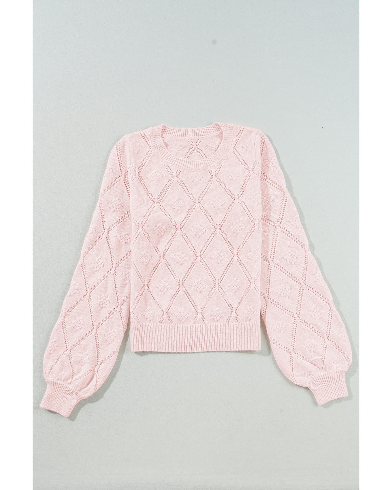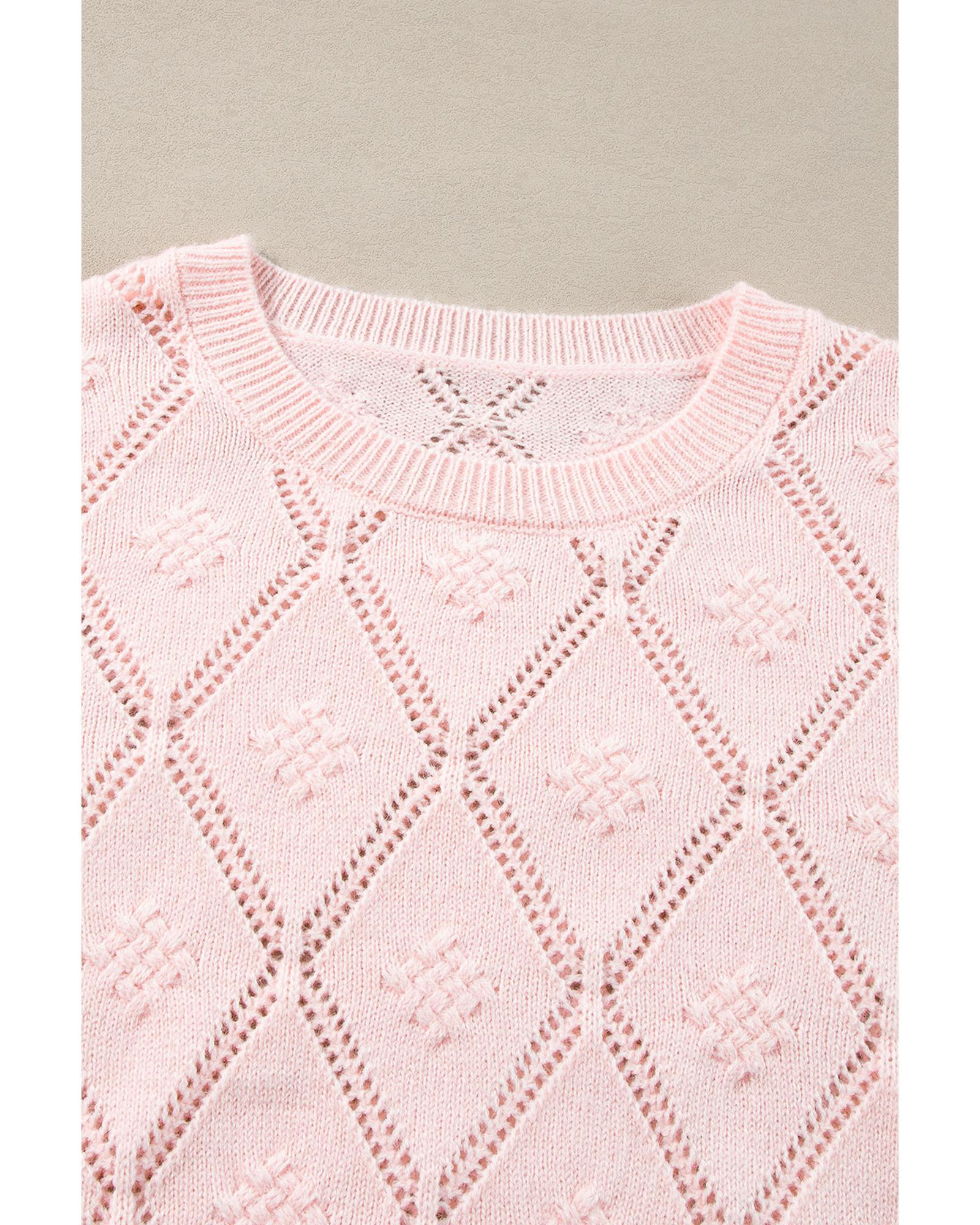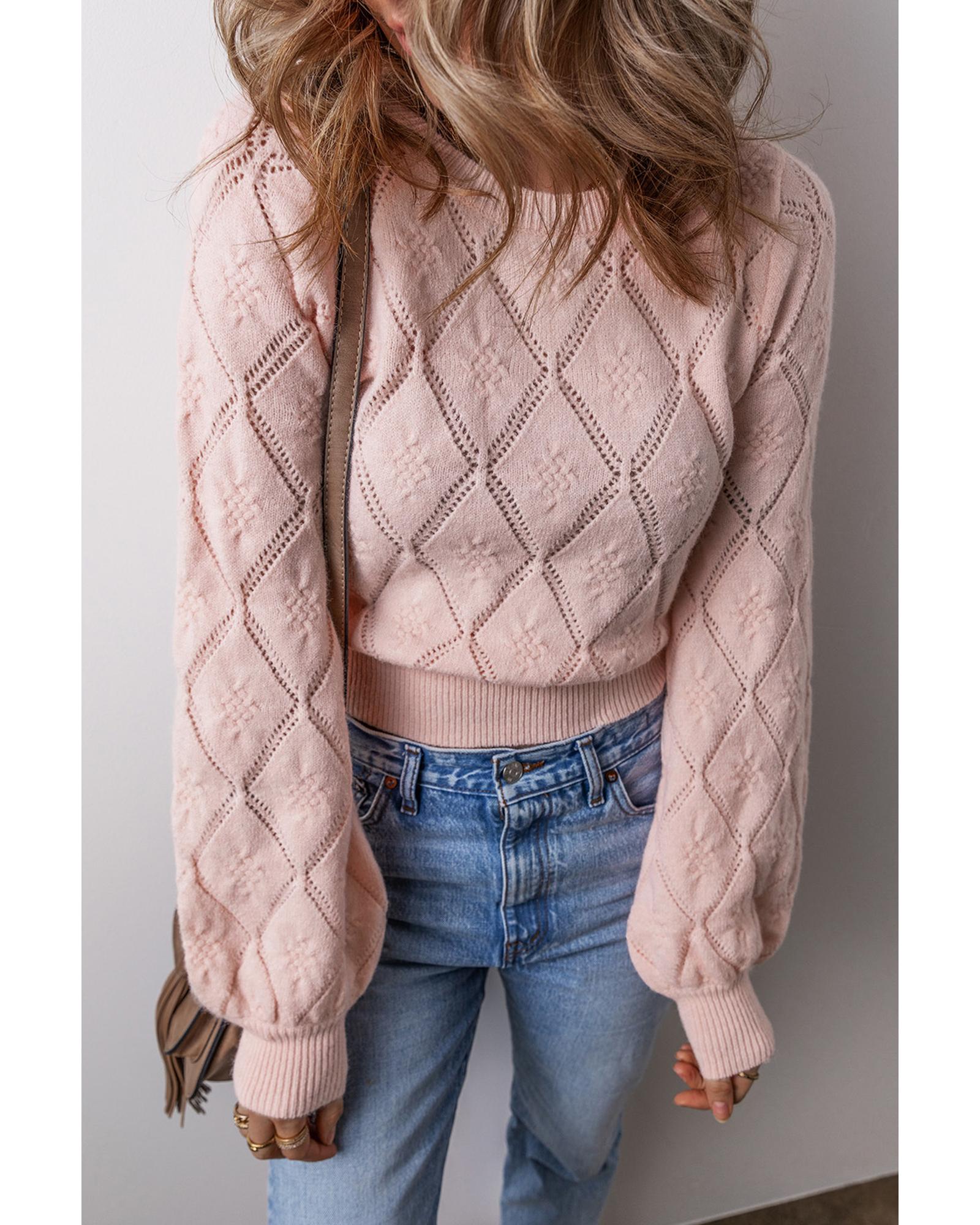 Gossamer Pink Openwork Plaid Puff Sleeve Cropped Sweater - XL