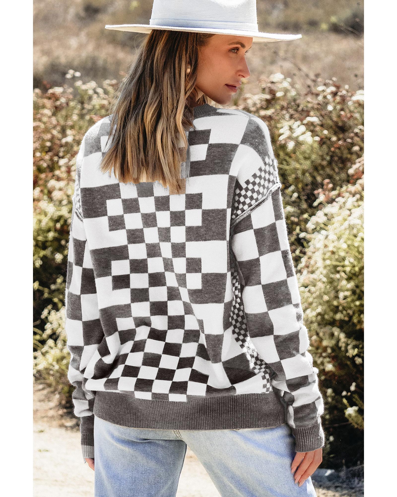 Gray Checkered Print Drop Shoulder Round Neck Sweater - L