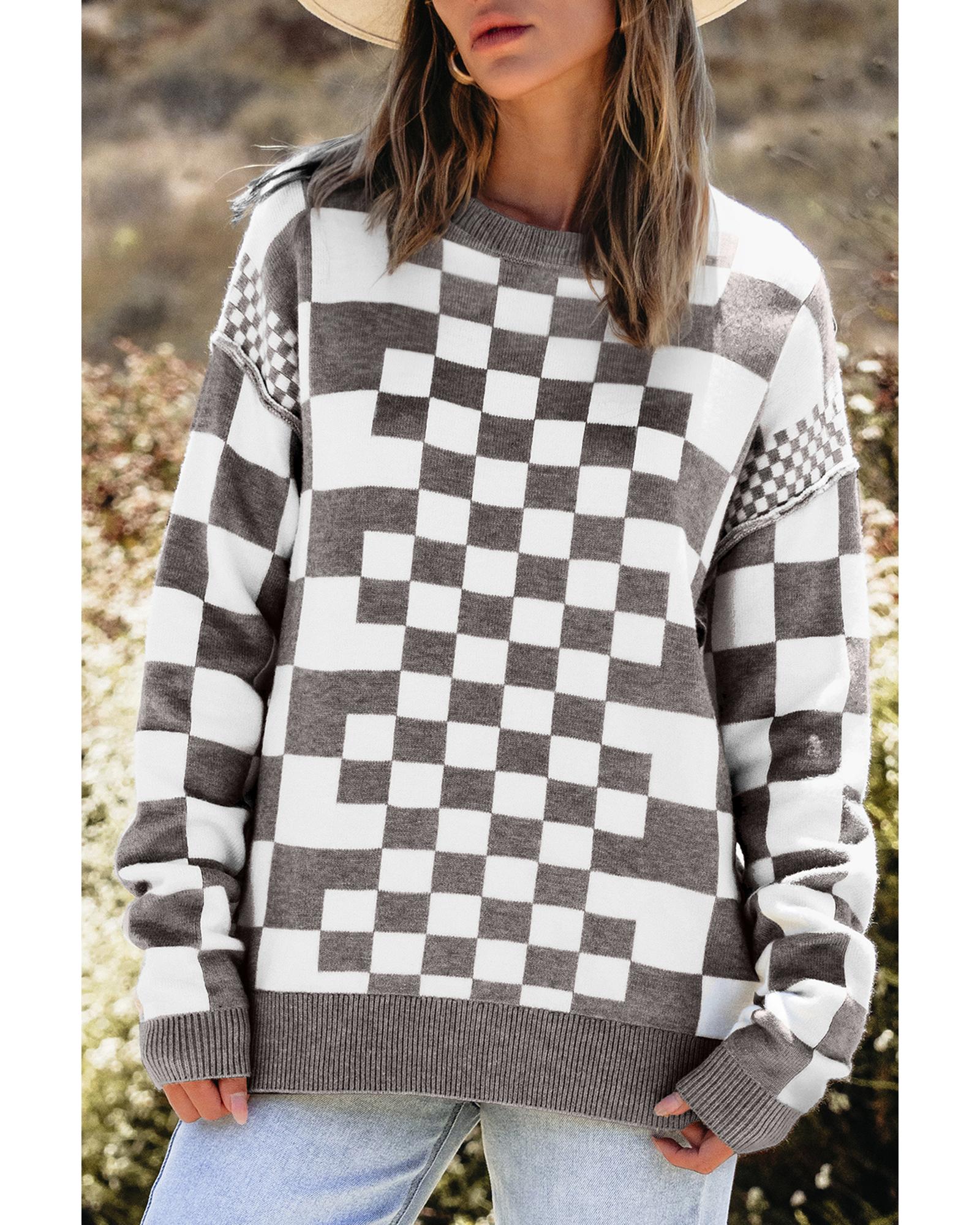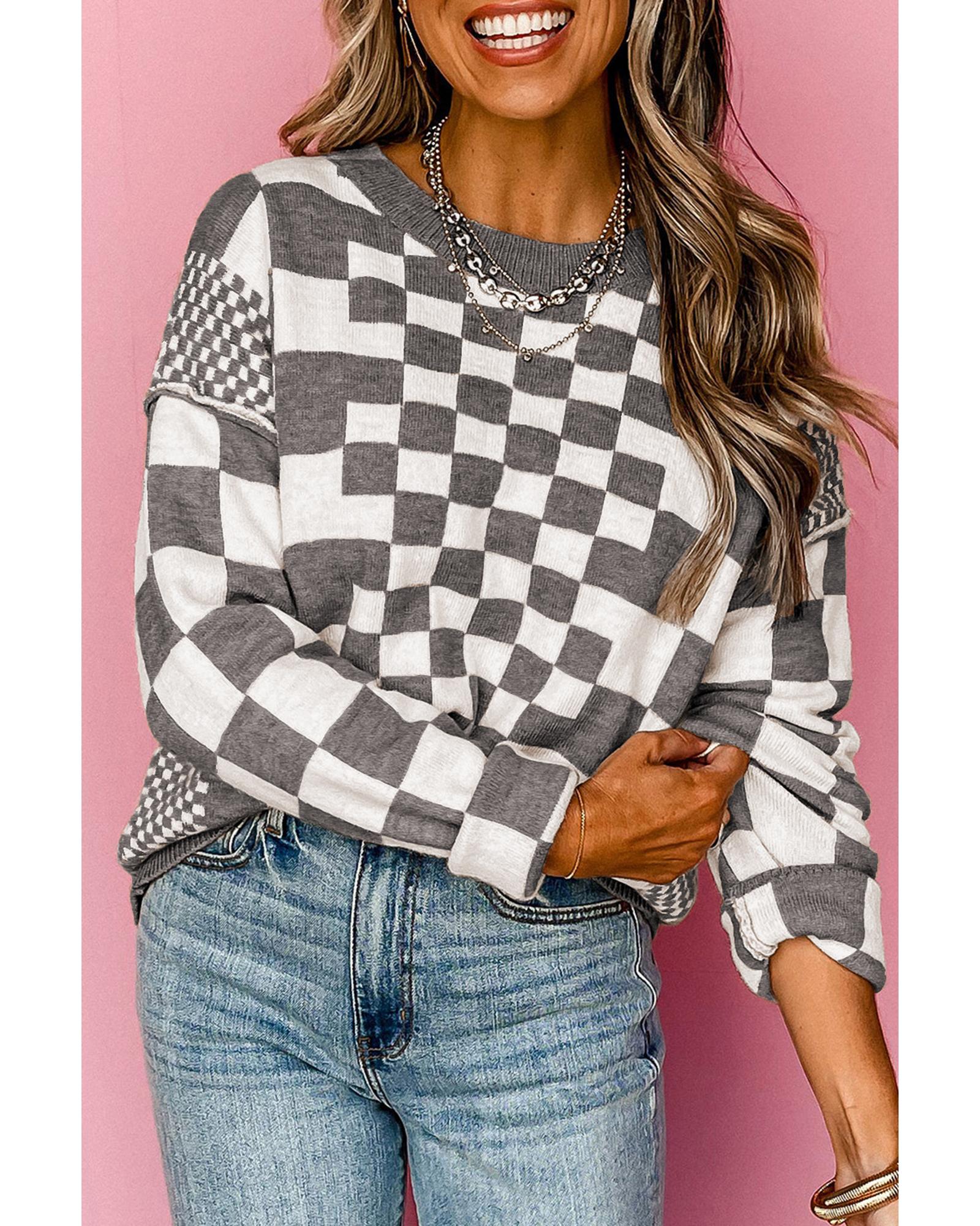 Gray Checkered Print Drop Shoulder Round Neck Sweater - S
