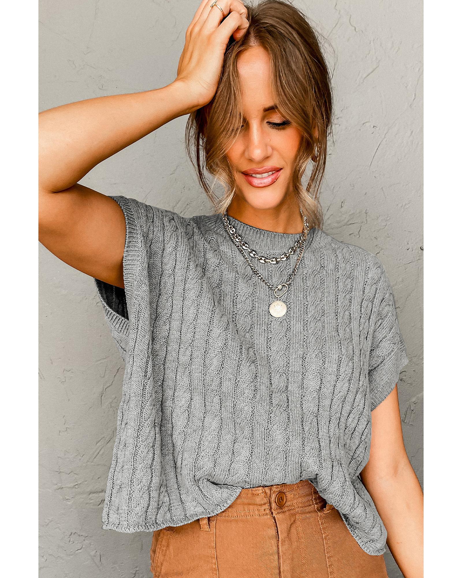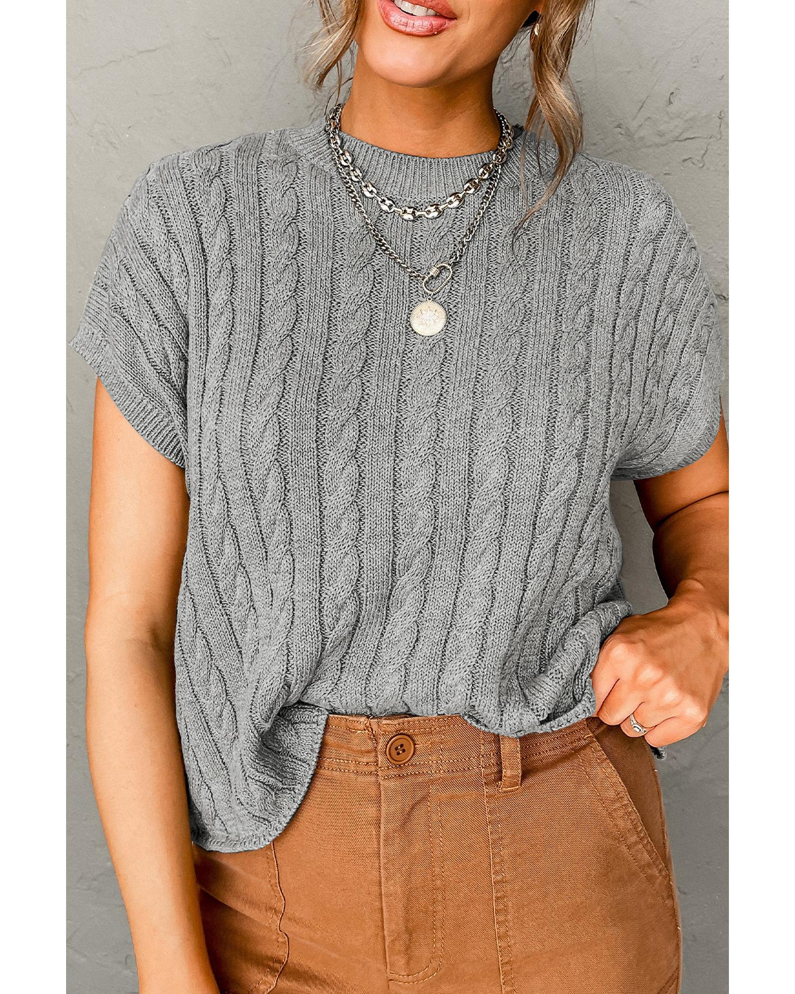 Gray Crew Neck Cable Knit Short Sleeve Sweater - S